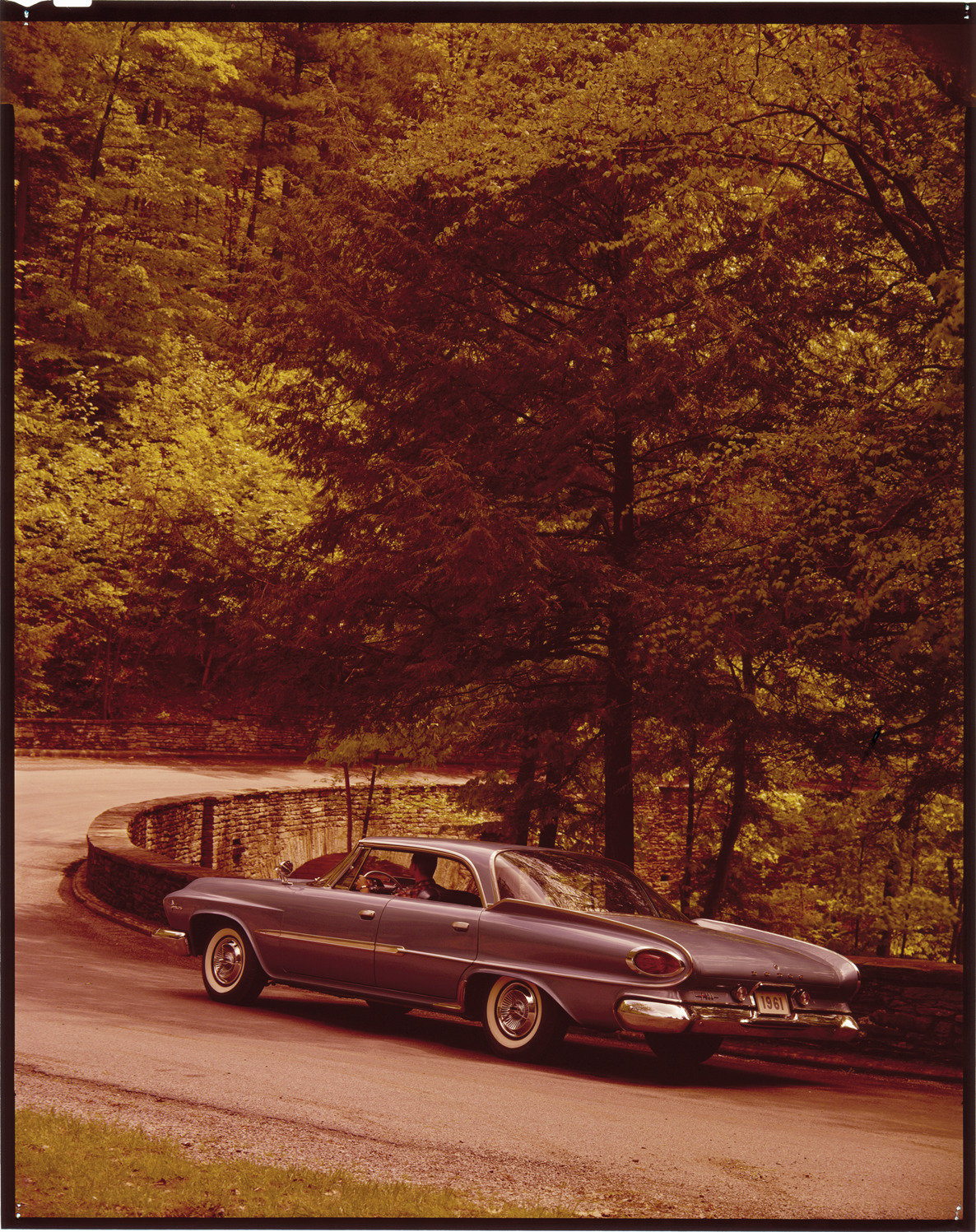 View of a man driving a 1961 Dodge Polara sedan. Label on sleeve: "Chrysler Corporation, Dodge, 1961."