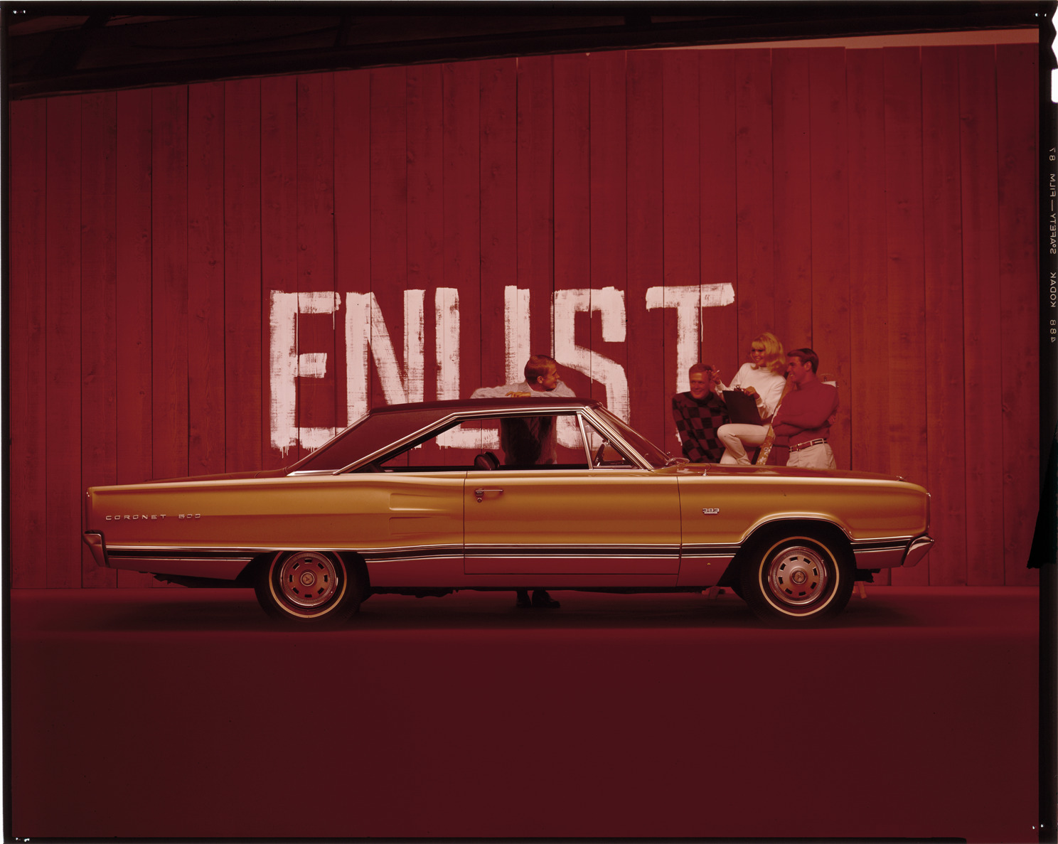 View of a woman and three men posing with 1966 Dodge Coronet coupe. "Enlist" is painted on wall in background. Label on sleeve: "Chrysler Corporation, Dodge Coronet, 1966."
