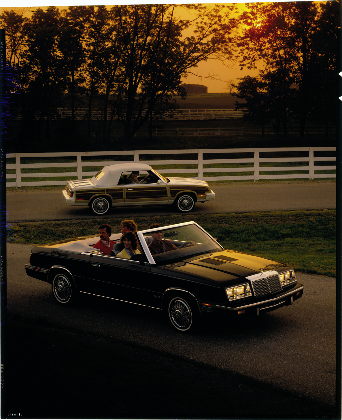 View of motorists in two 1989 Chrysler convertibles. Label on sleeve: "Chrysler Corporation, Chrysler line, 1989."