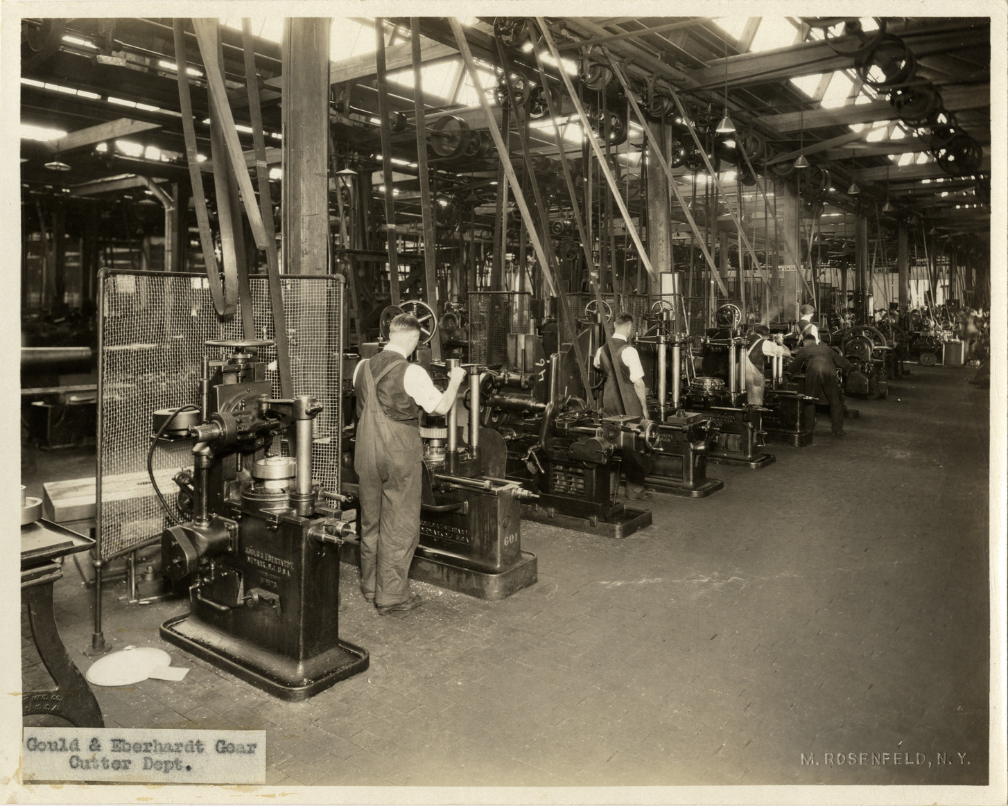 View of men operating Gould & Eberhardt gear cutting machines in the Gear Cutter Dept. at the Duesenberg Motor Company factory. Label on front: "Gould & Eberhardt Gear Cutter Dept." Embossed on front: "M. Rosenfeld, N.Y." Handwritten on back: "Factories--Duesenberg."