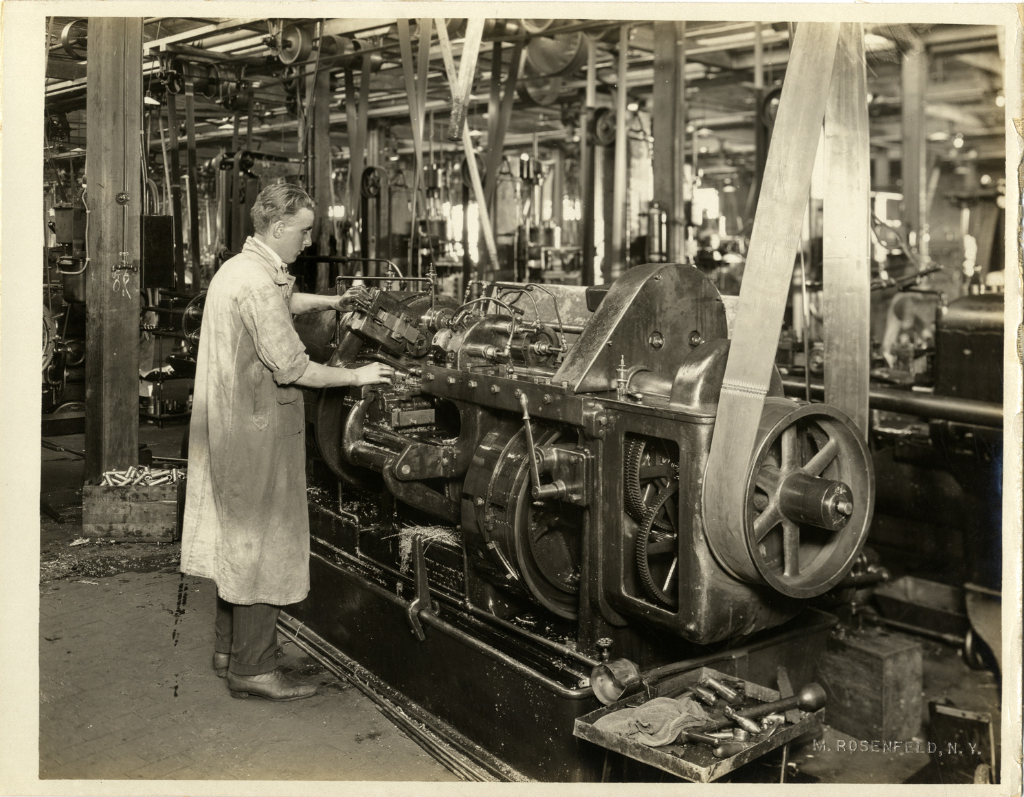 Favorite this☆ Worker operating lathe, Duesenberg Motor Company factory Description: View of a man operating a lathe at the Duesenberg Motor Company factory. Embossed on front: "M. Rosenfeld, N.Y." Handwritten on back: "Factories--Duesenberg." Details Resource ID: na034439 Creator: Rosenfeld, Morris, 1884-1968 Subject: Automobile factories Duesenberg Motor Company Automobile industry workers Lathes Photographers--New York (State)--New York Photographic prints Date Issued: Unknown year Format: 1 photographic print mounted on fabric ; 7.75 x 9.75 in. Member of: National Automotive History Collection Filing Location: Factories--Duesenberg Rights: Physical rights are retained by DPL. Copyright is retained in accordance with U.S. copyright laws.