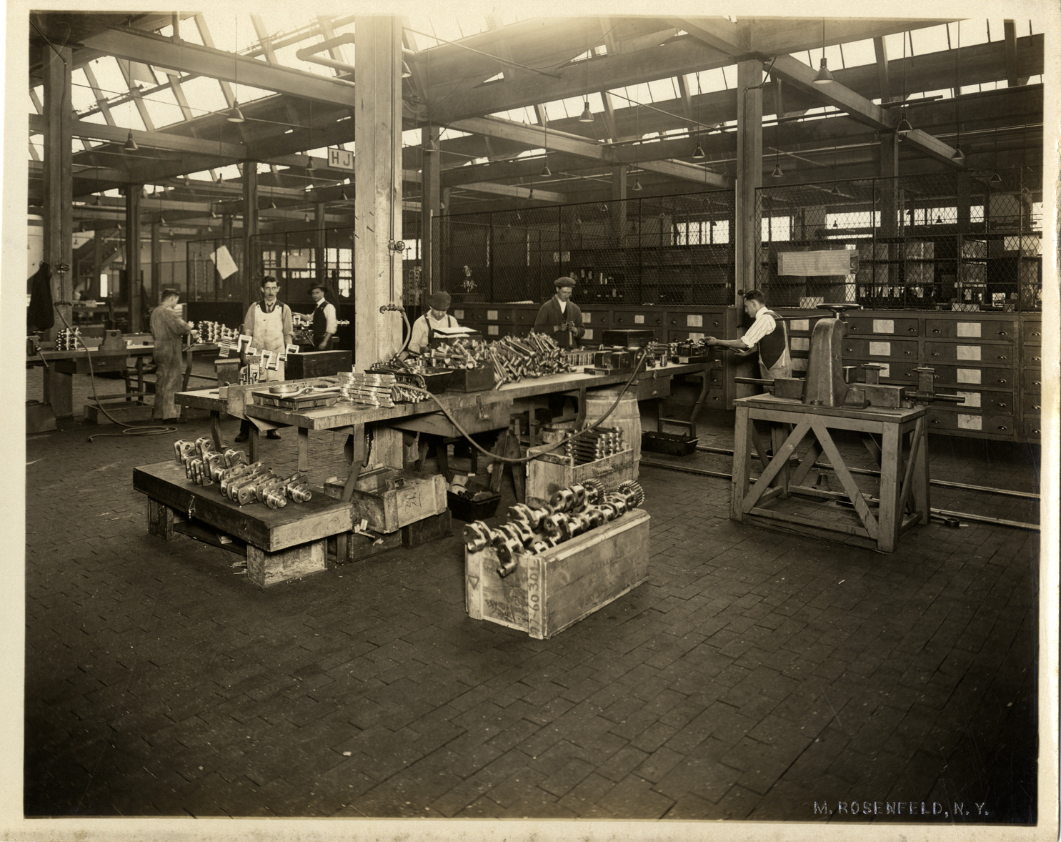 View of workers fitting bearings for connecting rods at the Duesenberg Motor Company factory. Embossed on front: "M. Rosenfeld, N.Y." Handwritten on back: "Factories--Duesenberg."