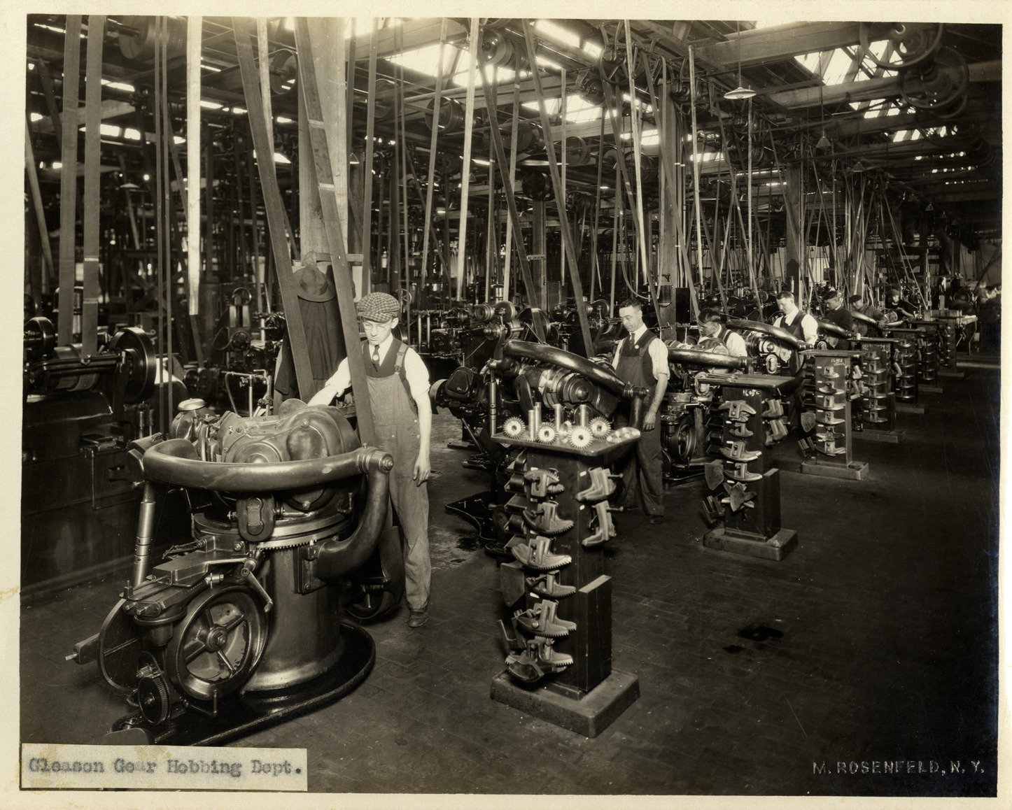 View of men operating Gleason gear hobbing machines at the Duesenberg Motor Company factory. Label on front: "Gleason Gear Hobbing Dept." Embossed on front: "M. Rosenfeld, N.Y." Handwritten on back: "Factories--Duesenberg."