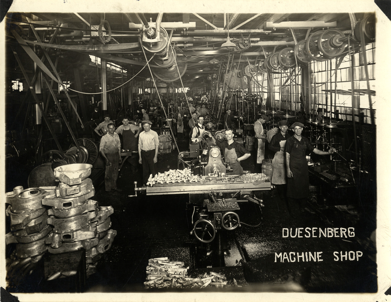 Favorite this☆ Machine shop, Duesenberg Motor Company factory Description: View of workers posing in the machine shop at the Duesenberg Motor Company factory. Printed on front: "Duesenberg. Machine shop." Handwritten on back: "Factories--Duesenberg." Details Resource ID: na034459 Subject: Machine shops Automobile industry workers Machinery Automobile factories Duesenberg Motor Company Photographic prints Date Issued: Unknown year Format: 1 photographic print ; 6.5 x 8.5 in. Member of: National Automotive History Collection Filing Location: MS36/Ricker, Chester S., Factories--Duesenberg Negative Number: 2218 F-2 Rights: Physical rights are retained by DPL. Copyright is retained in accordance with U.S. copyright laws.