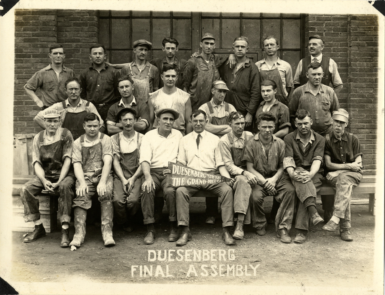 Group portrait of final assembly workers at the Duesenberg Motor Company factory. Three men in front row hold pennant reading: "Duesenberg Straight 8, the Grand Prix car." Printed on front: "Duesenberg. Motor assembly."