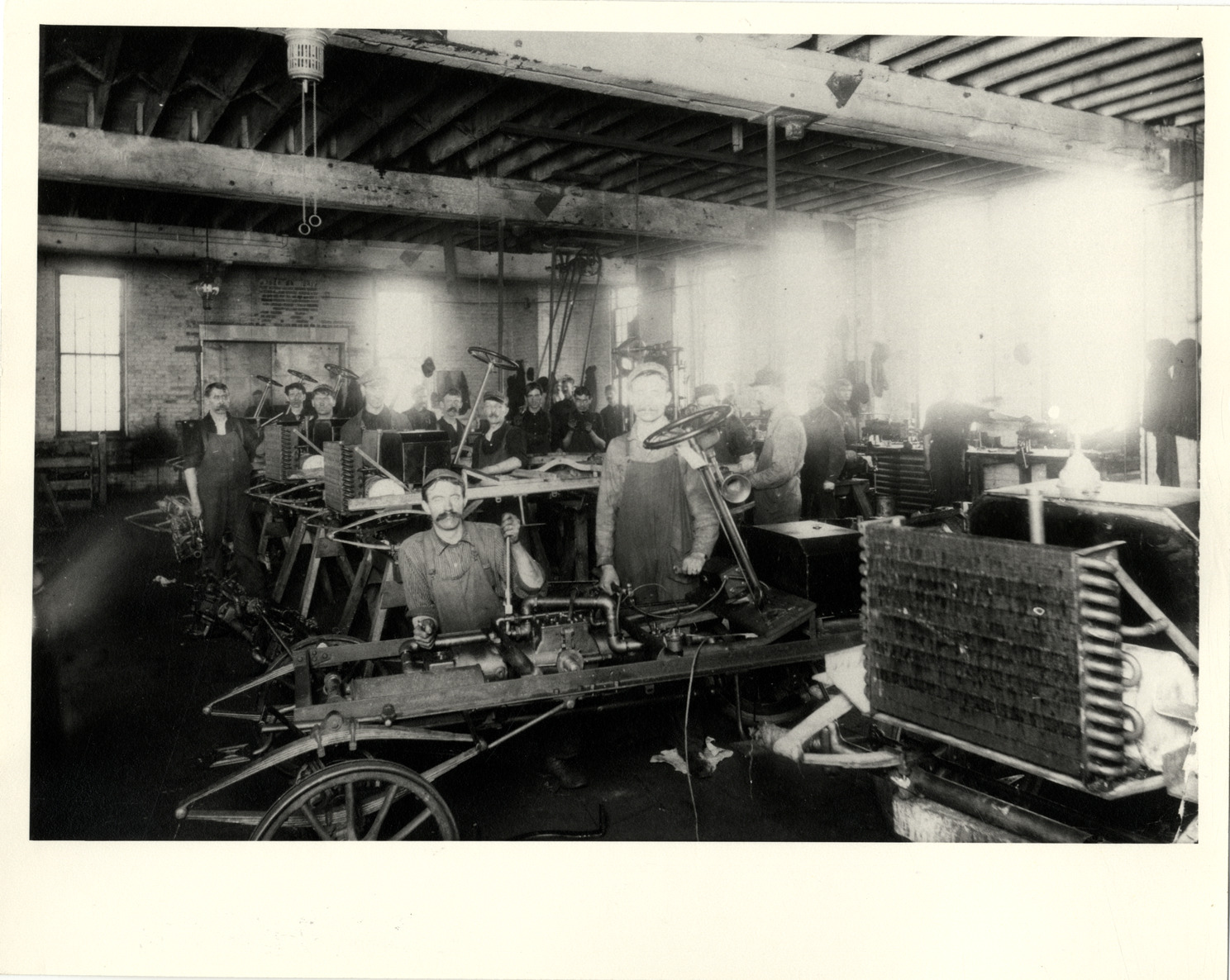 View of workers assembling chassis for Queen automobiles at the C.H. Blomstrom Motor Company factory. Handwritten on back: "C.H. Blomstrom. 1905, one corner of the chassis assembly department. Queen automobiles with 2-cylinder engines."