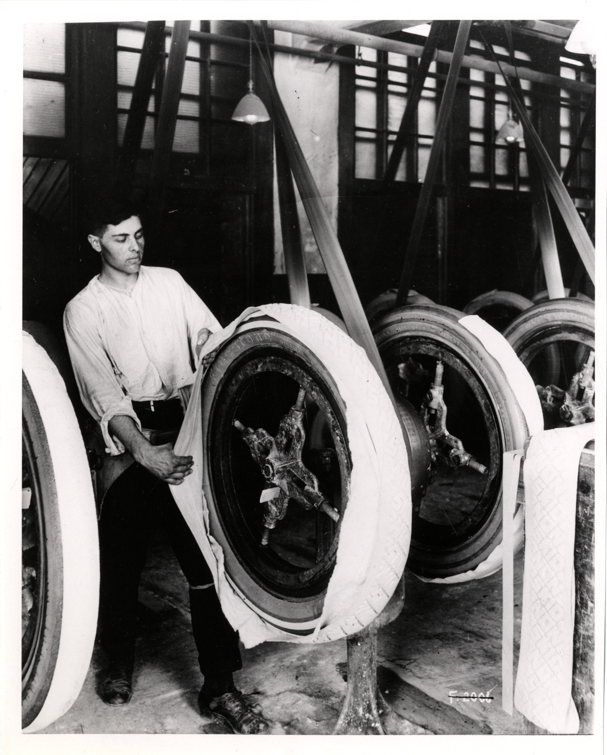 View of a man applying semi-cured tread to a tire at the Firestone Tire and Rubber Company factory. Handwritten on back: "The Firestone Tire & Rubber Company. Worker applies semi-cured tread to body of tire partially cured, preparatory to wrapping for final curing, method used in early 1900s. Factories--Firestone Tire Co."