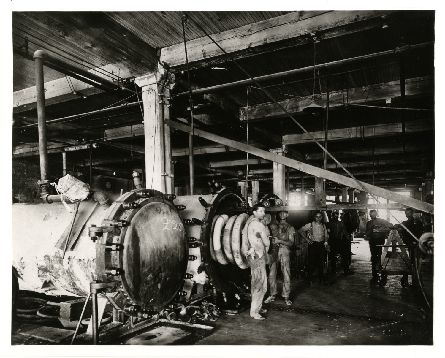Workers with vulcanizers, Firestone Tire and Rubber Company factory