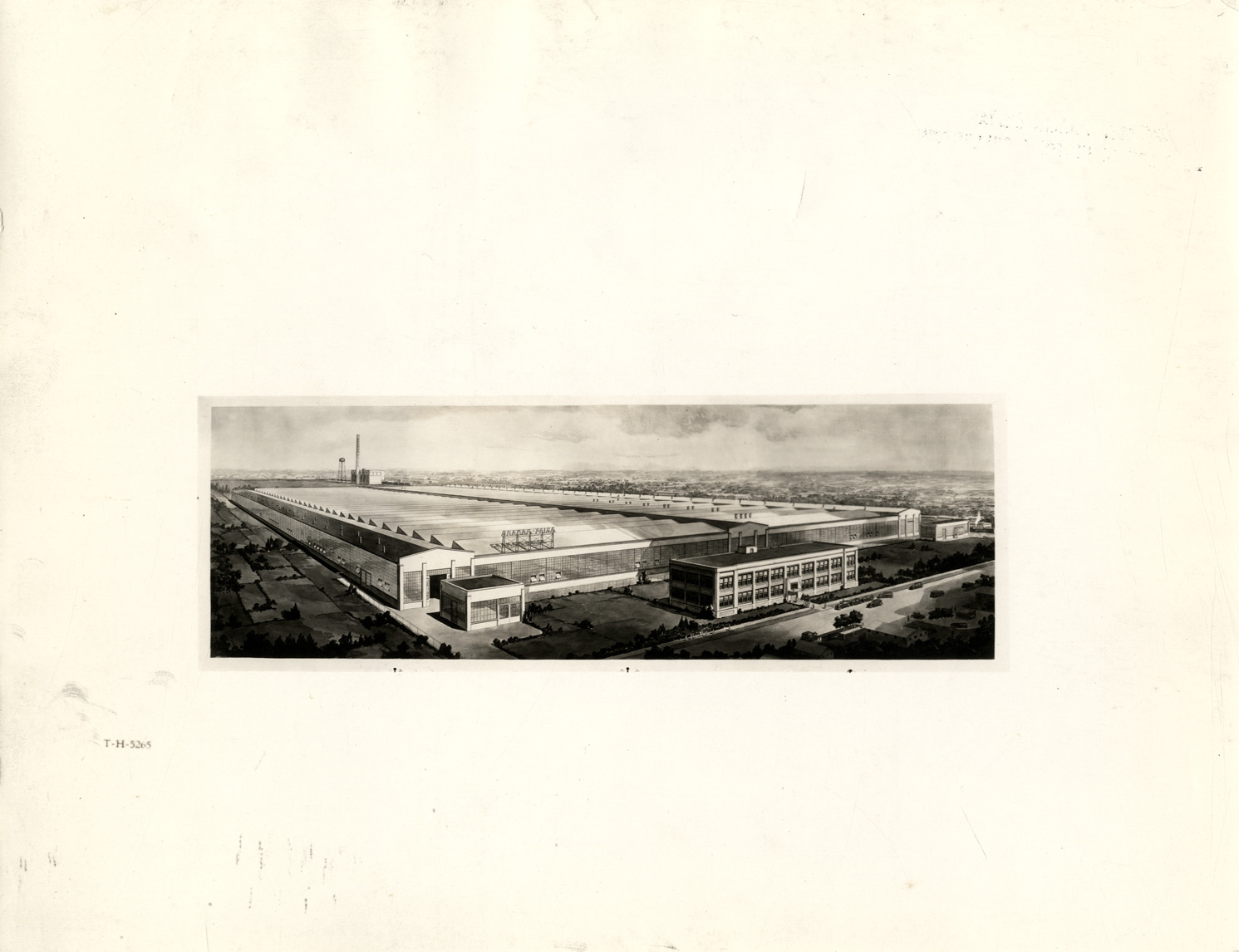 Artist's depiction of the Evansville Body Plant of the Graham-Paige Motors Corporation in Evansville, Indiana. Handwritten on back: "Evansville Body Plant, Evansville, Ind. Factories--Graham-Paige, '29."