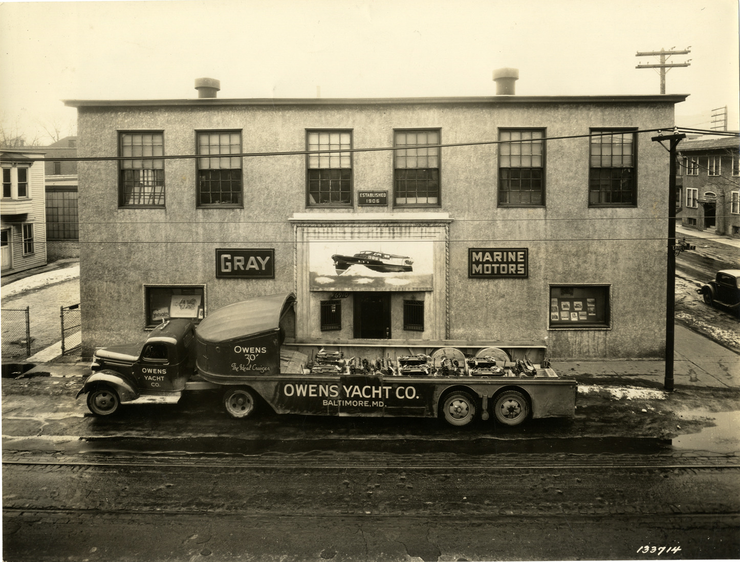 View of Owens Yacht Company truck, carrying load of marine engines, parked in front of the Gray Marine Motor Company factory. Sign on building: "Gray marine motors, established 1906." Illustration of boat is displayed over entrance. Painted on side of truck: "Owens Yacht Co., Baltimore, Md. Owens 30', the ideal cruiser." Stamped on back: "Manning Bros., Inc. Commercial photographers, 333 State St., fifth floor. Detroit, Michigan."