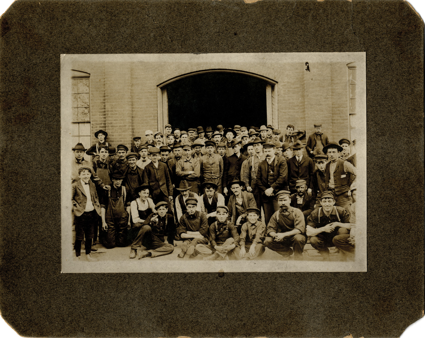 Group portrait of employees in front of the Hupp Motor Car Company in Milwaukee, Wisconsin. Handwritten on back: "Taken at factory at Milwaukee."