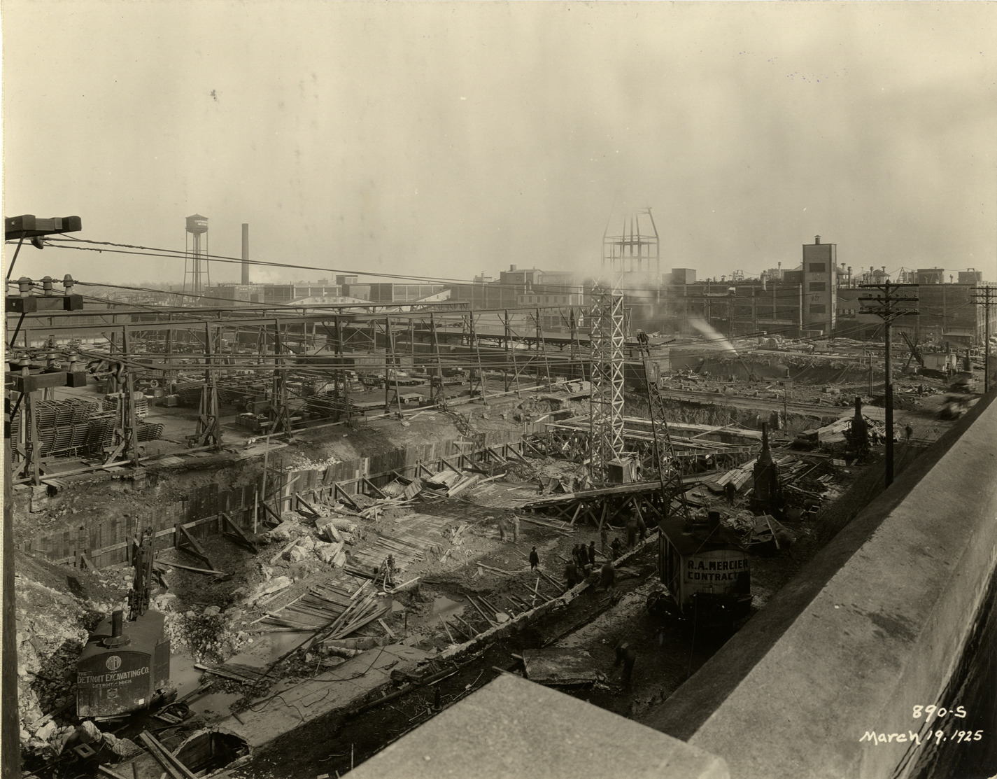View of steam shovel and crane excavating the foundation for the Hudson Motor Car Company factory. Printed on front: "890-S. March 19, 1925." Stamped on back: "Frank H. Stone, commercial photographer. Hickory 5131, 3449 Garland, Detroit, Michigan." Handwritten on back: "3/19/25, showing new Connors [sic] Ave. bldg. under construction. Factories--Hudson."