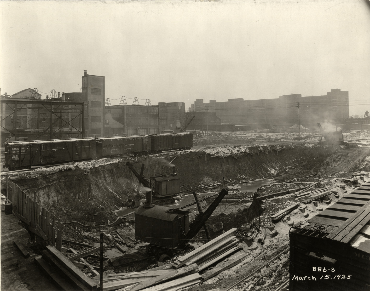 View of steam shovels excavating the foundation for the Hudson Motor Car Company factory. Railroad freight cars in background. Printed on front: "886-S. March 15, 1925." Stamped on back: "Frank H. Stone, commercial photographer. Hickory 5131, 3449 Garland, Detroit, Michigan." Handwritten on back: "3/15/25, showing excavating operation for new Conners [sic] Ave. bldg. Factories--Hudson."
