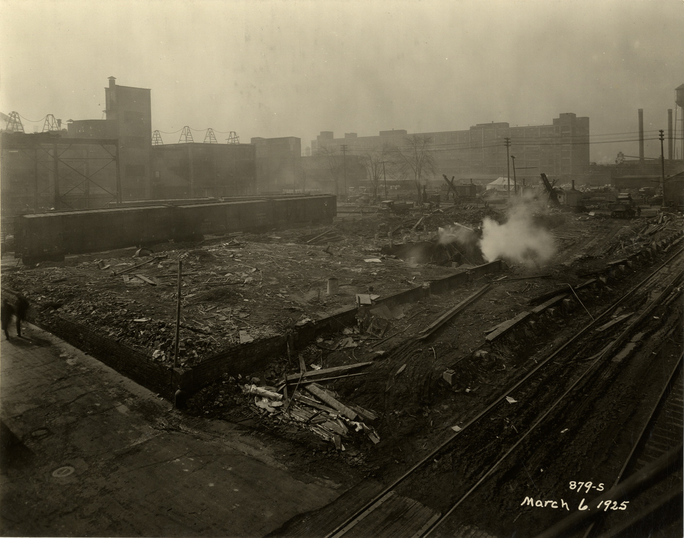View of steam shovel excavating the foundation for the Hudson Motor Car Company factory. Railroad freight cars in background. Printed on front: "879-S. March 6, 1925." Stamped on back: "Frank H. Stone, commercial photographer. Hickory 5131, 3449 Garland, Detroit, Michigan." Handwritten on back: "3/6/25, showing excavating operations for new building on Conners [sic] Ave. Factories--Hudson."