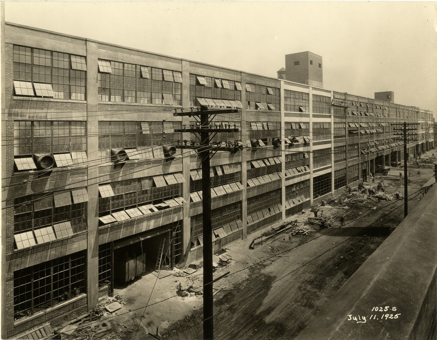 View of the Hudson Motor Car Company factory during construction. Printed on front: "1025-S. July 11, 1925." Handwritten on back: "New Connors [sic] Ave. bldg. under construction. Factories--Hudson."