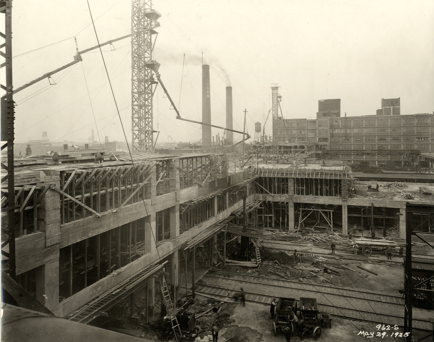 View of the Hudson Motor Car Company factory during construction. Wagons in foreground. Printed on front: "962-S. May 29, 1925." Handwritten on back: "May 29/1925. Showing new Connors [sic] Ave. bldg. under construction. Factories--Hudson."