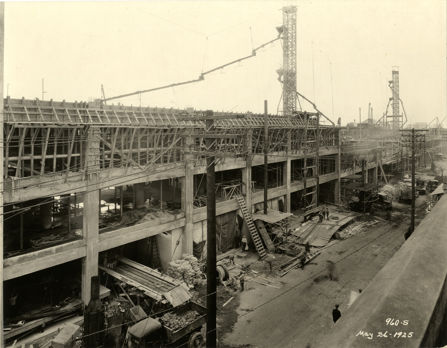 View of the Hudson Motor Car Company factory during construction. Printed on front: "960-S. May 26, 1925." Stamped on back: "Frank H. Stone, commercial photographer. Hickory 5131, 3449 Garland, Detroit, Michigan." Handwritten on back: "May 26, 1925. Showing new Connors [sic] Ave. bldg. under construction. Factories--Hudson."