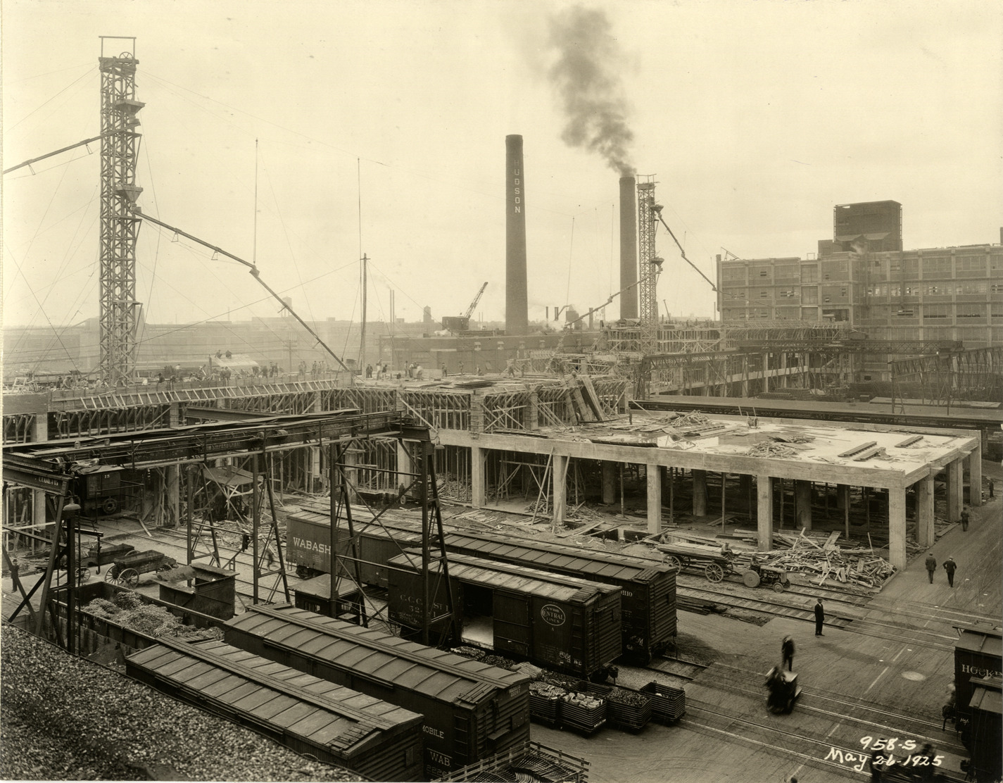 View of the Hudson Motor Car Company factory during construction. Railroad freight cars in foreground. Printed on front: "958-S. May 26, 1925." Stamped on back: "Frank H. Stone, commercial photographer. Hickory 5131, 3449 Garland, Detroit, Michigan." Handwritten on back: "May 26/1925. Showing new Connors [sic] Ave. bldg. under construction. Factories--Hudson."