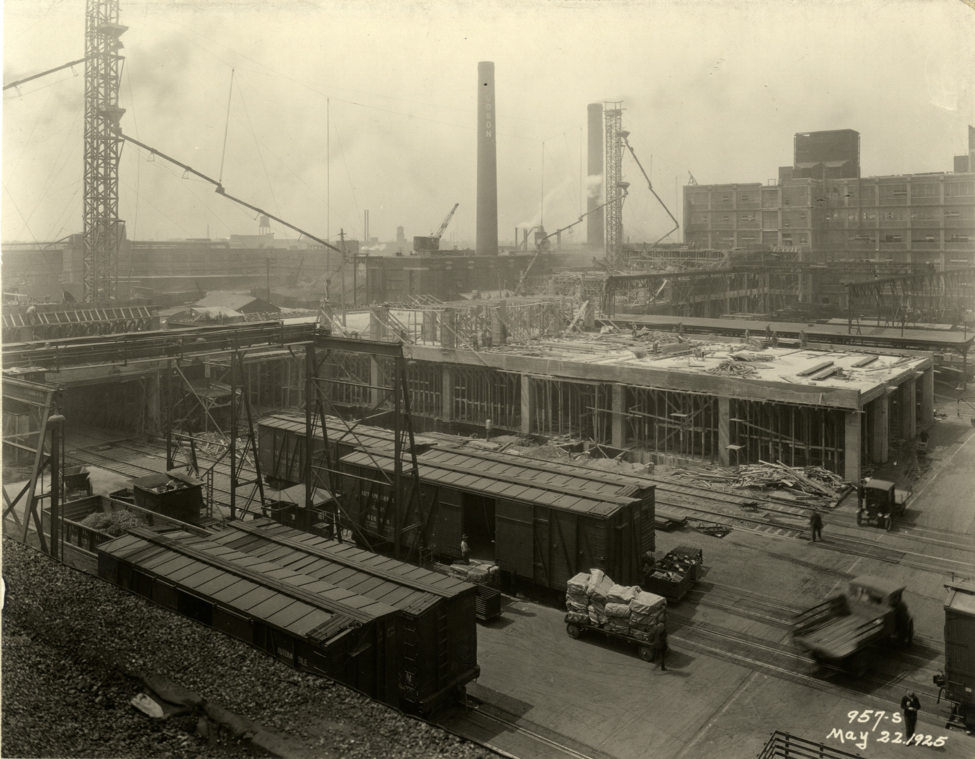 View of the Hudson Motor Car Company factory during construction. Railroad freight cars in foreground. Printed on front: "957-S. May 22, 1925." Stamped on back: "Frank H. Stone, commercial photographer. Hickory 5131, 3449 Garland, Detroit, Michigan." Handwritten on back: "May 22/25. Showing new Connors [sic] Ave. bldg. under construction. Factories--Hudson."