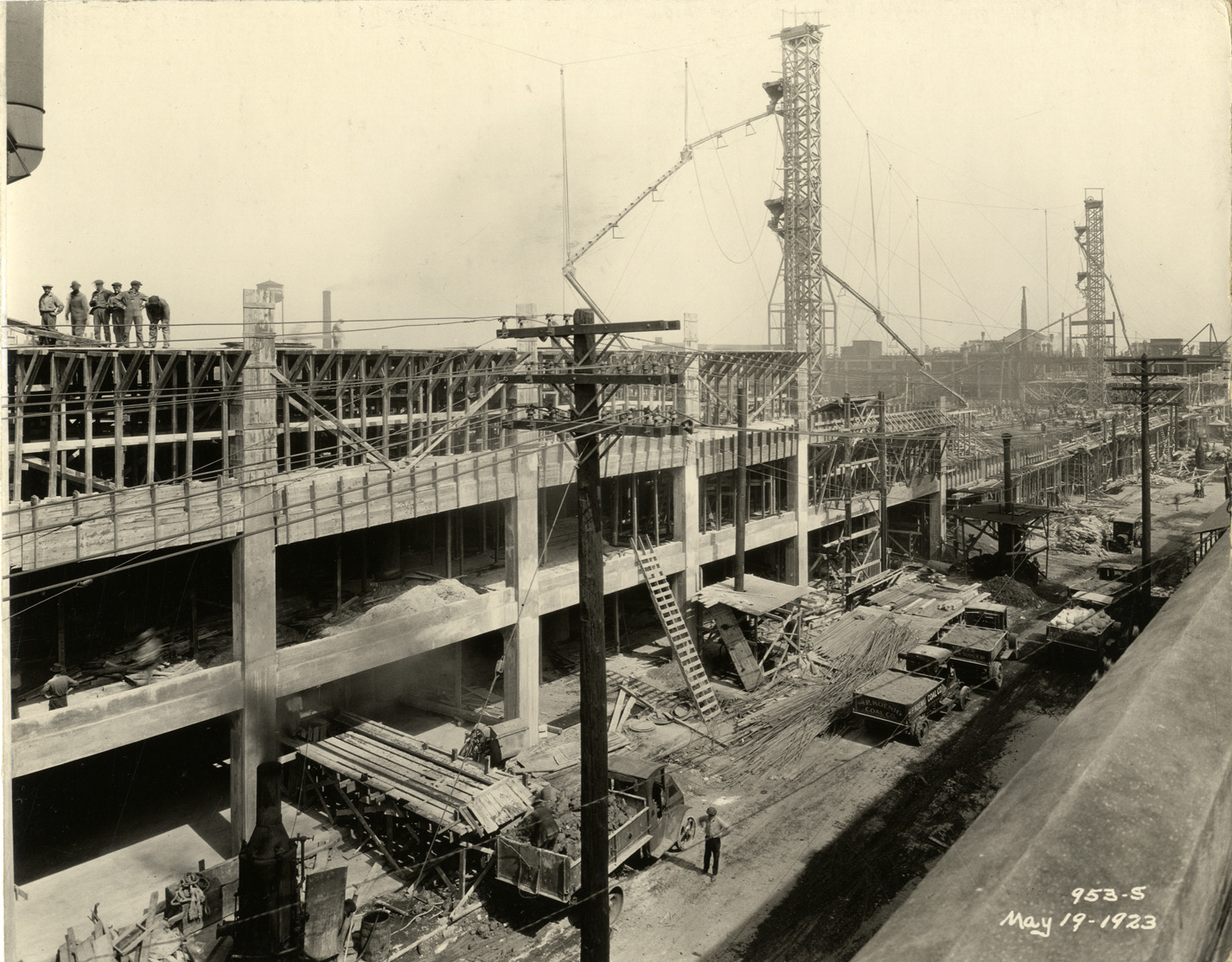View of the Hudson Motor Car Company factory during construction. Trucks in foreground. Printed on front: "953-S. May 19, 1925." Handwritten on back: "May 19/25. Showing new Connors [sic] Ave. bldg. under construction. Factories--Hudson."