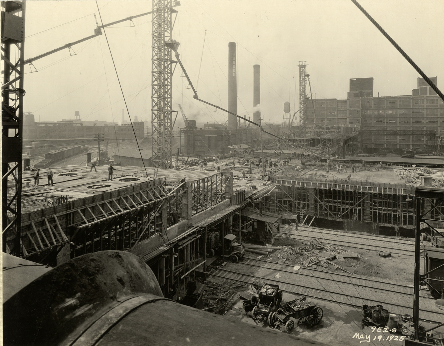 View of the Hudson Motor Car Company factory during construction. Wagons loaded with construction debris in foreground. Printed on front: "952-S. May 19, 1925." Handwritten on back: "May 19/25. Showing new Connors [sic] Ave. bldg. under construction. Factories--Hudson."