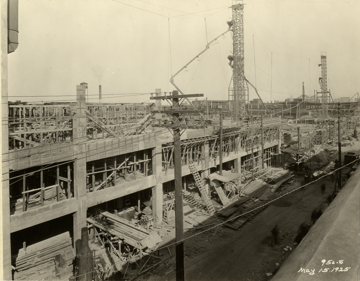 View of the Hudson Motor Car Company factory during construction. Printed on front: "950-S. May 15, 1925." Stamped on back: "Frank H. Stone, commercial photographer. Hickory 5131, 3449 Garland, Detroit, Michigan." Handwritten on back: "May 15/25. Showing new Connors [sic] Ave. bldg. under construction. Factories--Hudson."
