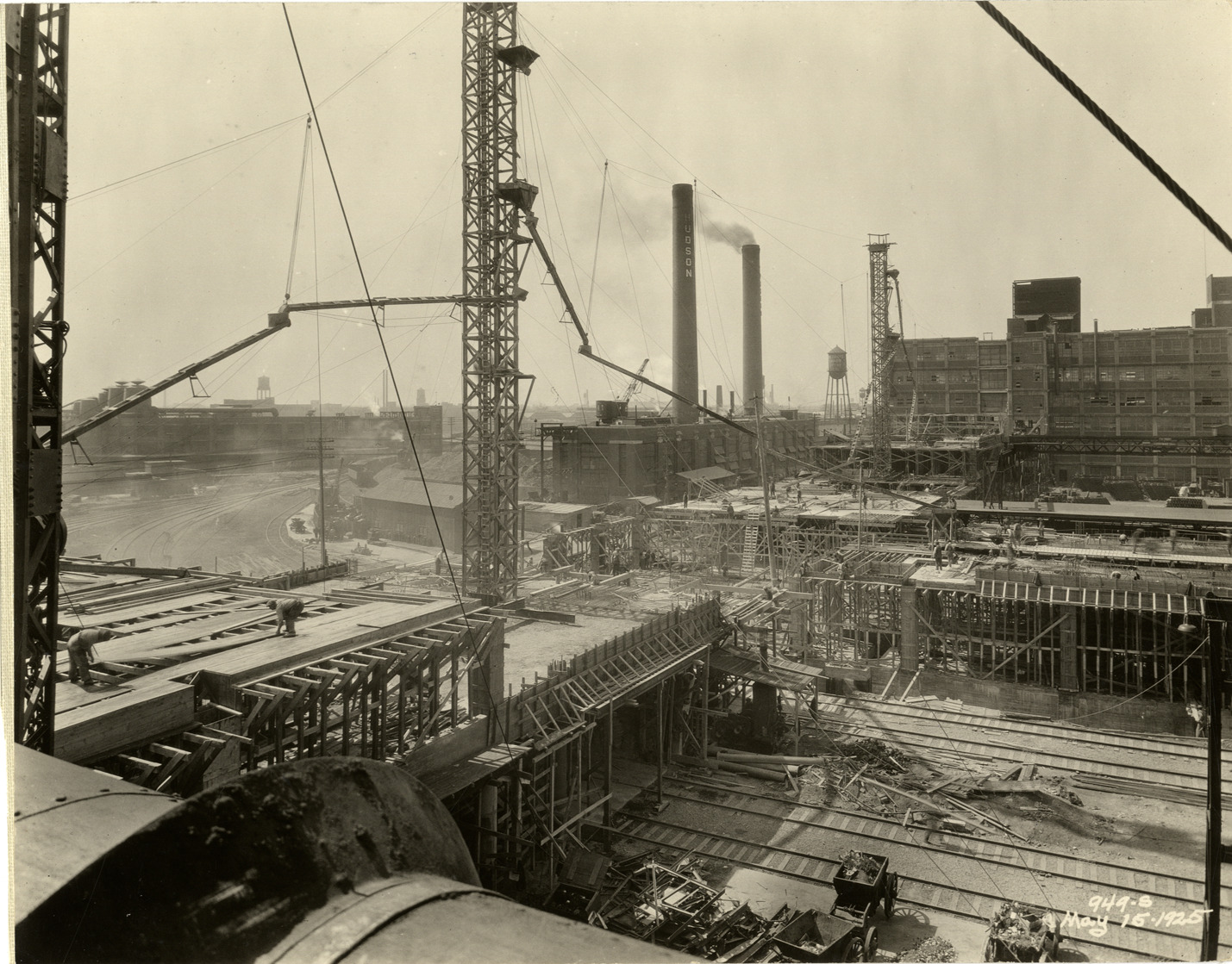 View of the Hudson Motor Car Company factory during construction. Printed on front: "949-S. May 15, 1925." Stamped on back: "Frank H. Stone, commercial photographer. Hickory 5131, 3449 Garland, Detroit, Michigan." Handwritten on back: "May 15/25. Showing new Connors [sic] Ave. bldg. under construction. Factories--Hudson."