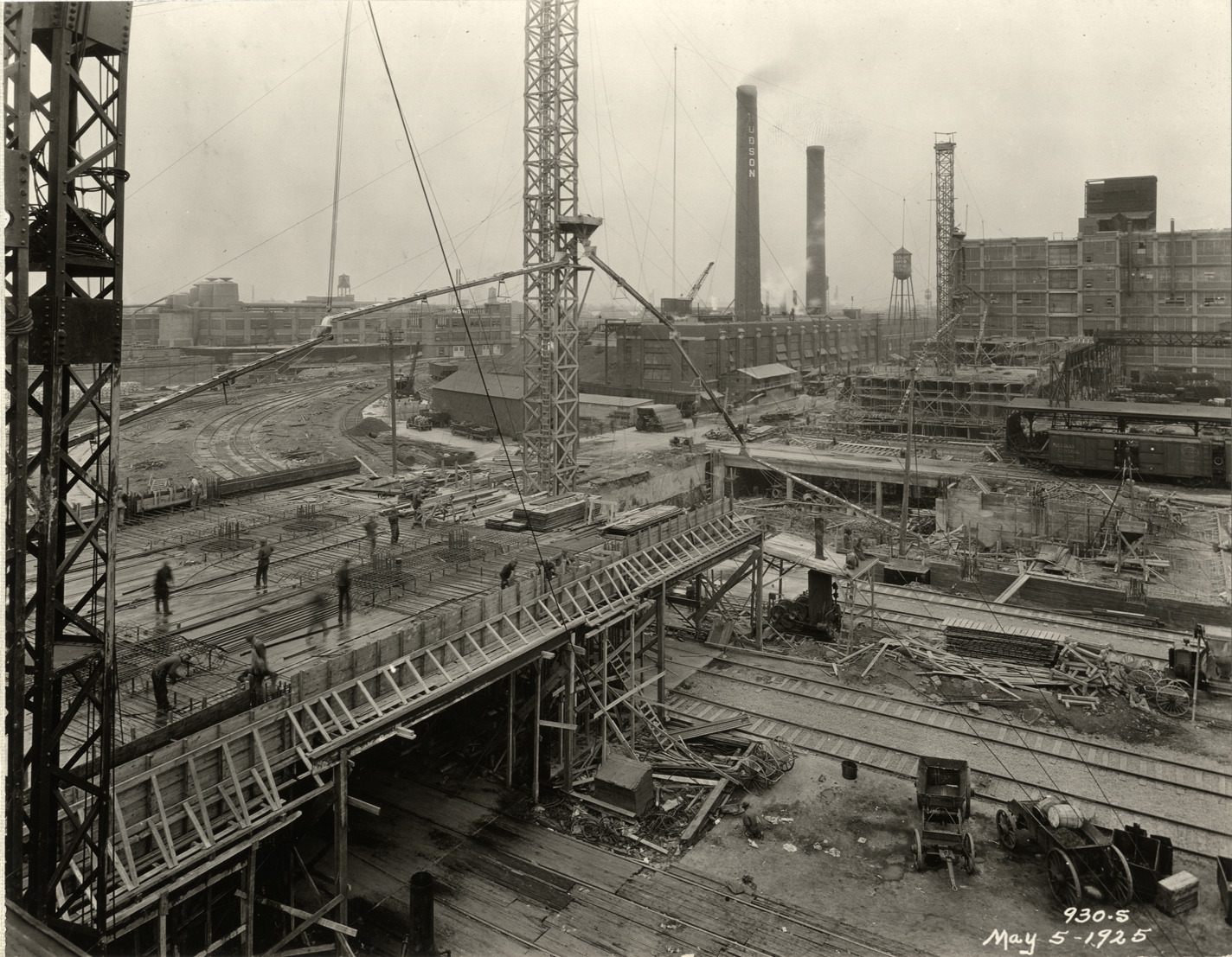 View of the Hudson Motor Car Company factory during construction. Printed on front: "930-S. May 5, 1925." Stamped on back: "Frank H. Stone, commercial photographer. Hickory 5131, 3449 Garland, Detroit, Michigan." Handwritten on back: "May 5/25. Showing new Connors [sic] Ave. bldg. under construction. Factories--Hudson."