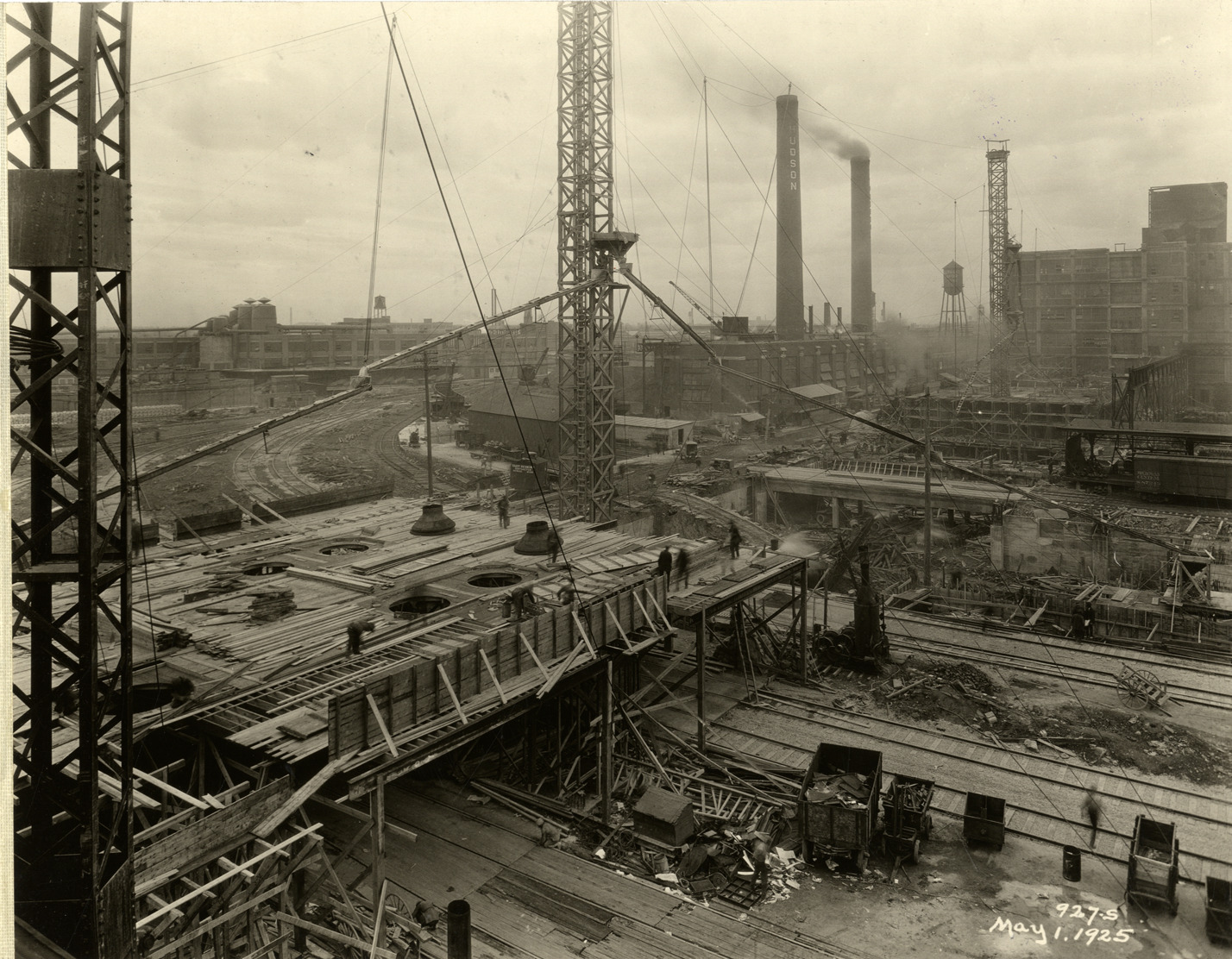 View of the Hudson Motor Car Company factory during construction. Printed on front: "927-S. May 1, 1925." Stamped on back: "Frank H. Stone, commercial photographer. Hickory 5131, 3449 Garland, Detroit, Michigan." Handwritten on back: "May 1/25. Showing new Connors [sic] Ave. bldg. under construction. Factories--Hudson."