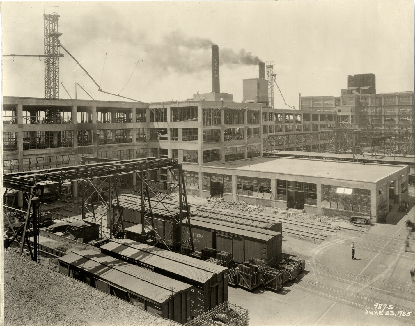 View of the Hudson Motor Car Company factory during construction. Railroad freight cars in foreground. Printed on front: "987-S. June 23, 1925." Handwritten on back: "6/23/25. Showing new Connors [sic] Ave. bldg. under construction. Factories--Hudson."
