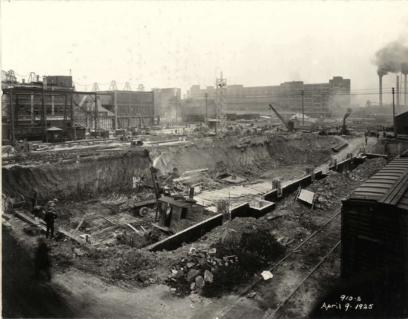 View of steam shovel and truck excavating foundation for the Hudson Motor Car Company factory. Printed on front: "910-S. April 9, 1925." Stamped on back: "Frank H. Stone, commercial photographer. Hickory 5131, 3449 Garland, Detroit, Michigan." Handwritten on back: "4/9/25, showing new Connors [sic] Ave. building under construction. Factories--Hudson."
