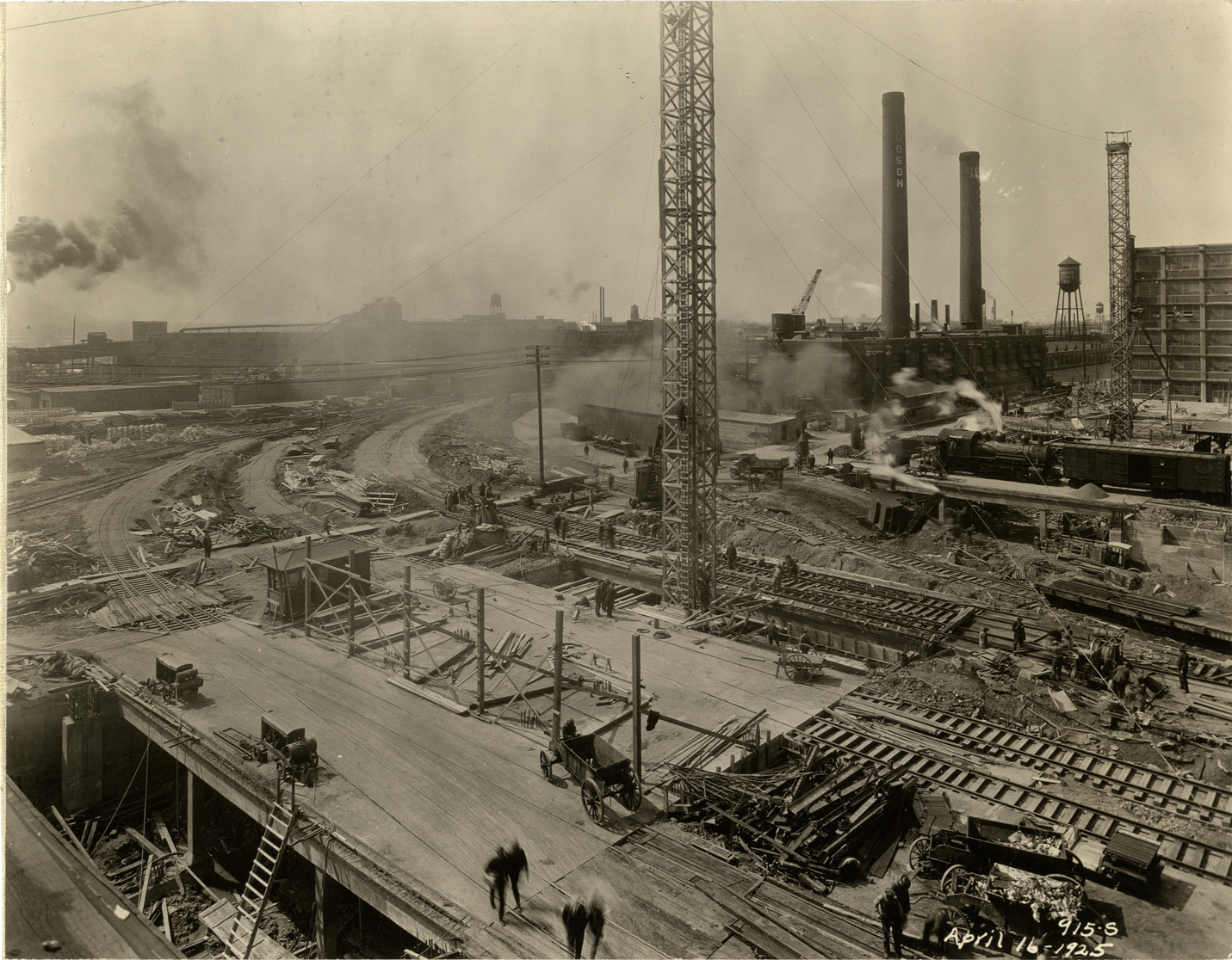 View of the Hudson Motor Car Company factory during construction. Printed on front: "915-S. April 16, 1925." Stamped on back: "Frank H. Stone, commercial photographer. Hickory 5131, 3449 Garland, Detroit, Michigan." Handwritten on back: "April 16/25. Showing new Connors [sic] Ave. bldg. under construction. Factories--Hudson."