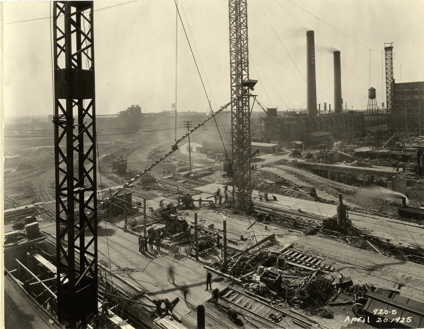 View of the Hudson Motor Car Company factory during construction. Printed on front: "920-S. April 20, 1925." Handwritten on back: "April 20/25. Showing new Connors [sic] Ave. bldg. under construction. Factories--Hudson."
