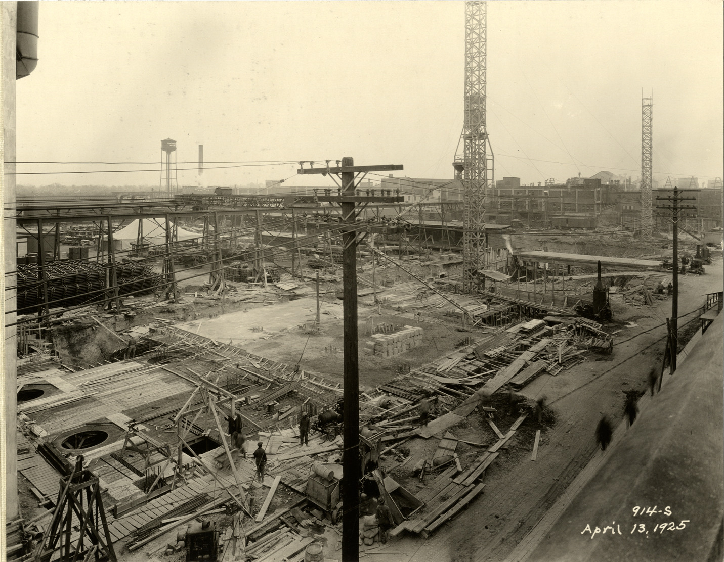 View of foundation excavation and construction of the Hudson Motor Car Company factory. Printed on front: "914-S. April 13, 1925." Stamped on back: "Frank H. Stone, commercial photographer. Hickory 5131, 3449 Garland, Detroit, Michigan." Handwritten on back: "4/13/25, showing new Connors [sic] Ave. building under construction. Factories--Hudson."