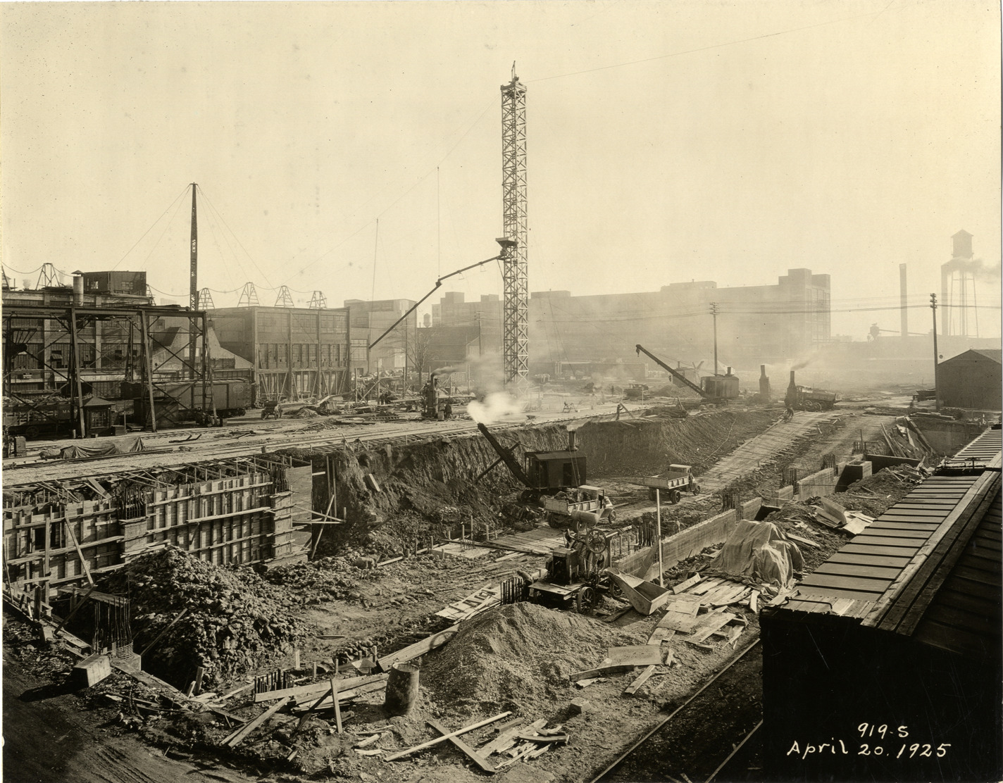 View of steam shovel excavating the foundation for the Hudson Motor Car Company factory. Printed on front: "919-S. April 20, 1925." Stamped on back: "Frank H. Stone, commercial photographer. Hickory 5131, 3449 Garland, Detroit, Michigan." Handwritten on back: "April 20/25. Showing new Connors [sic] Ave. bldg. under construction. Factories--Hudson."