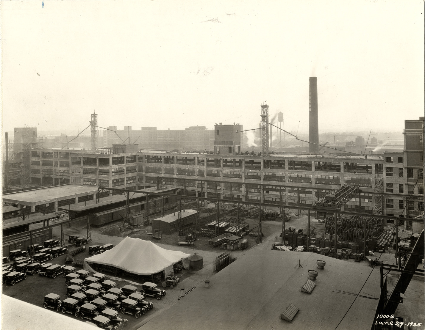 View of the Hudson Motor Car Company factory during construction. Hudson cars parked in foreground. Printed on front: "1000-S. June 29, 1925." Handwritten on back: "Showing new Connors [sic] Ave. bldg. under construction. Factories--Hudson."