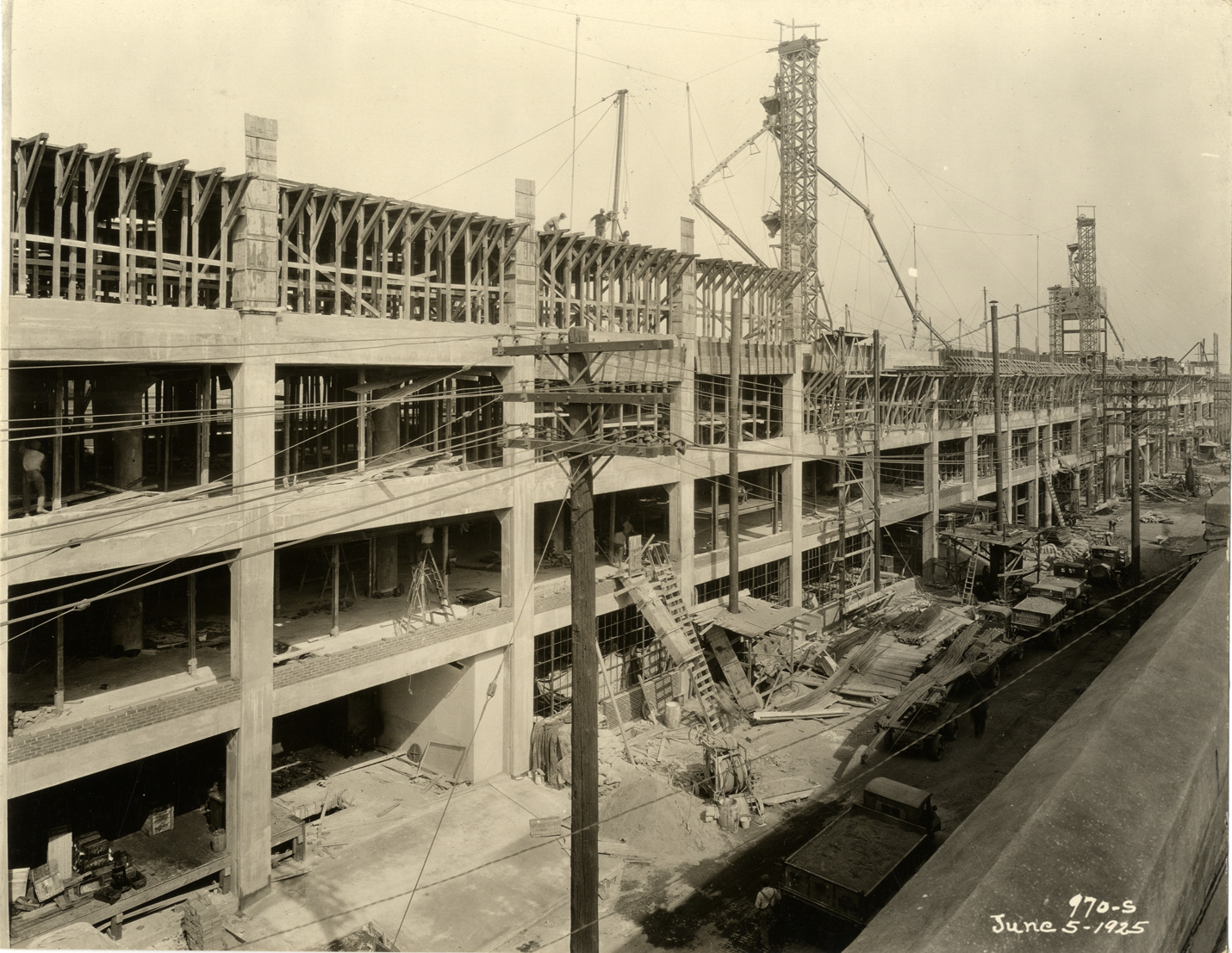 View of the Hudson Motor Car Company factory during construction. Printed on front: "970-S. June 5, 1925." Handwritten on back: "6/5/25. Showing new Connors [sic] Ave. bldg. under construction. Factories--Hudson."