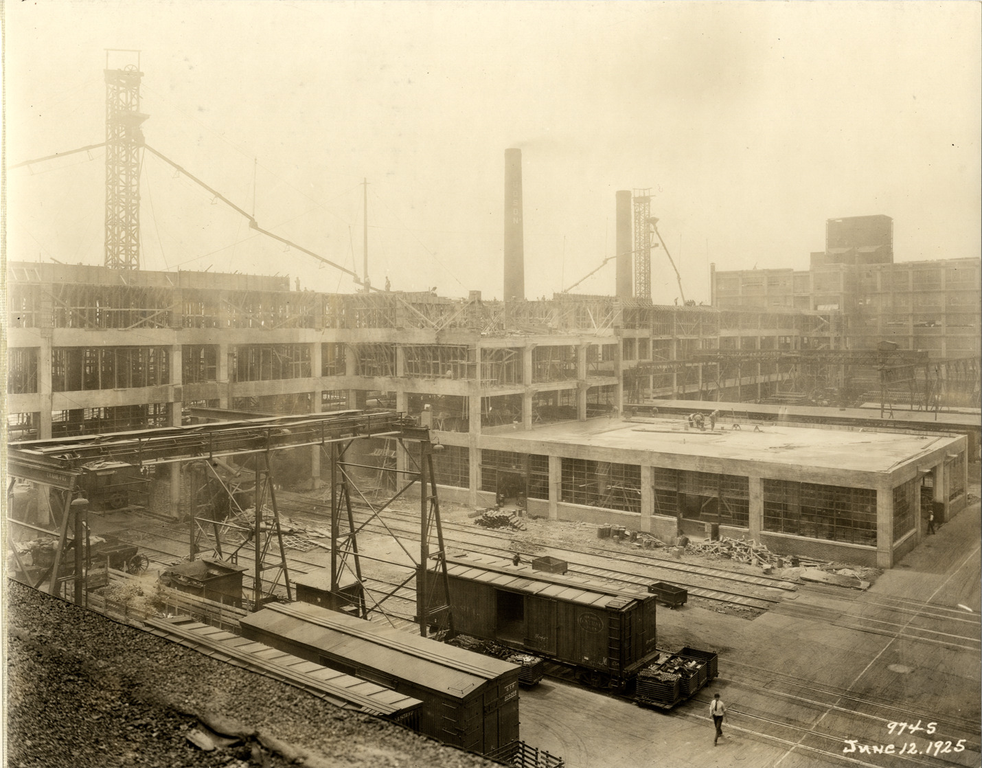 View of the Hudson Motor Car Company factory during construction. Railroad freight cars in foreground. Printed on front: "974-S. June 12, 1925." Handwritten on back: "6/12/25. Showing new Connors [sic] Ave. bldg. under construction. Factories--Hudson."