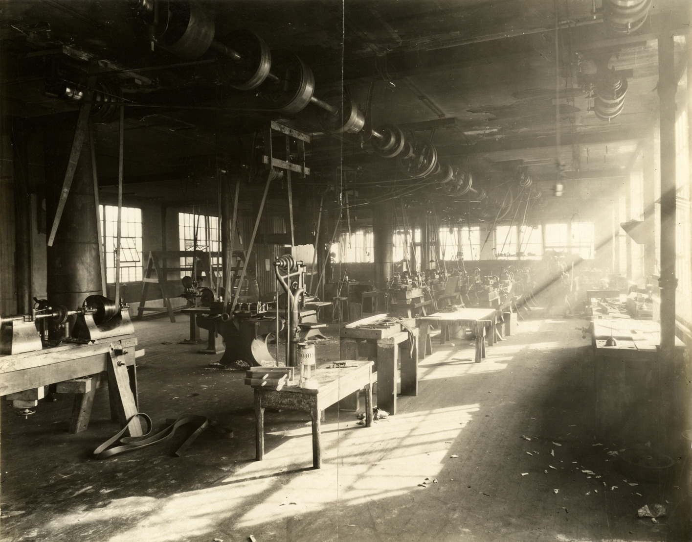 View of the interior of the Kessler Motor Car Company, showing rows of machines and pulleys. Stamped on back: "American Commercial Photo Co., 234 State St., Cadillac 6489, Detroit, Mich." Handwritten on back: "Factories--Kessler Motor Co."