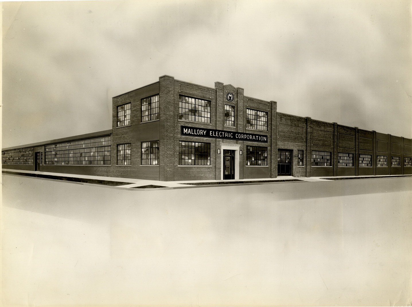 Artist's depiction of the Mallory Electric Corporation factory. Label on back: "Stereo or electro 4" wide will be furnished if you can use it. The Fred M. Randall Co." Handwritten on back: "Factories--Mallory, 1935."
