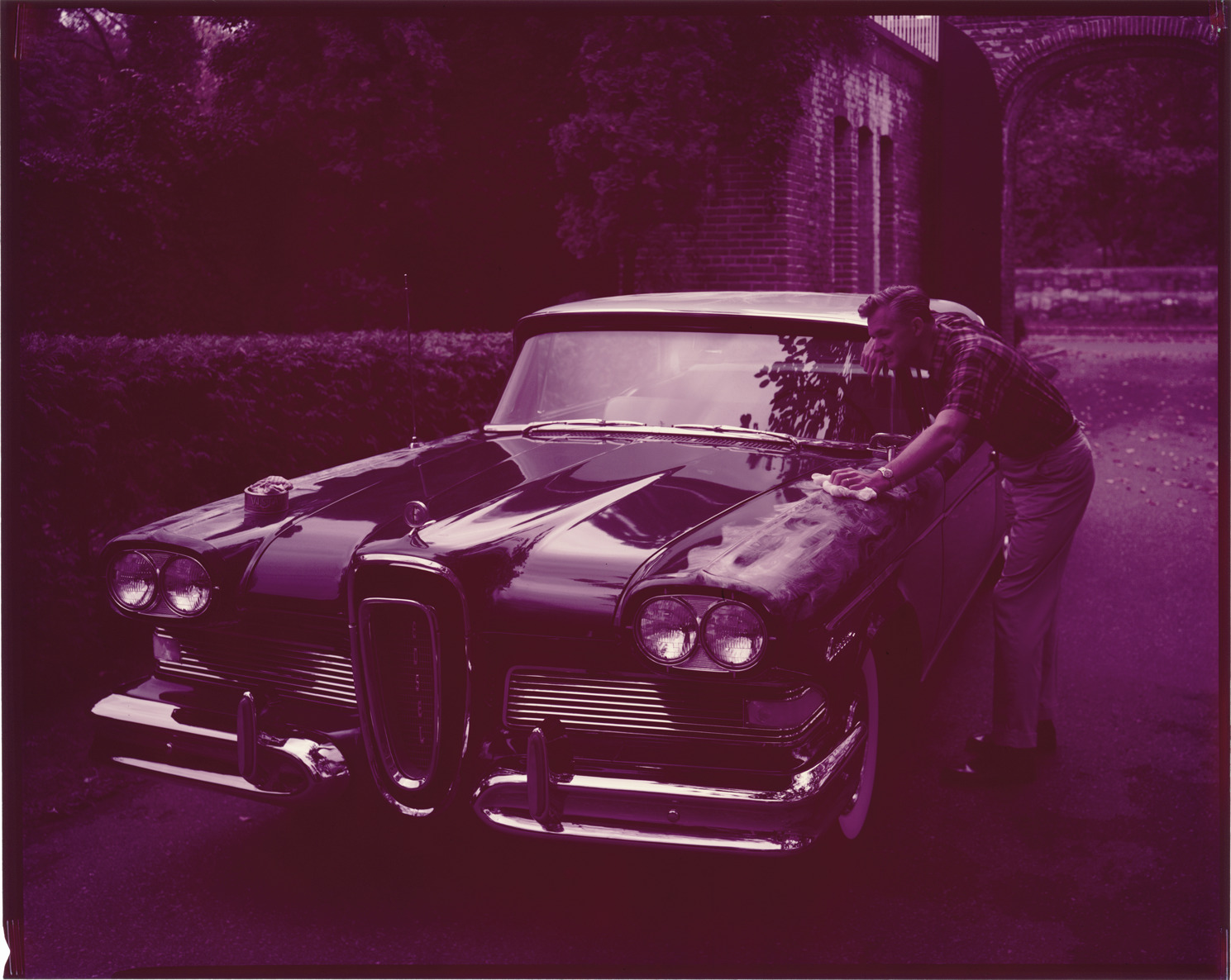 View of a man polishing a 1958 Edsel coupe. Label on sleeve: "Ford Motor Co., Edsel, advertising, 1958."