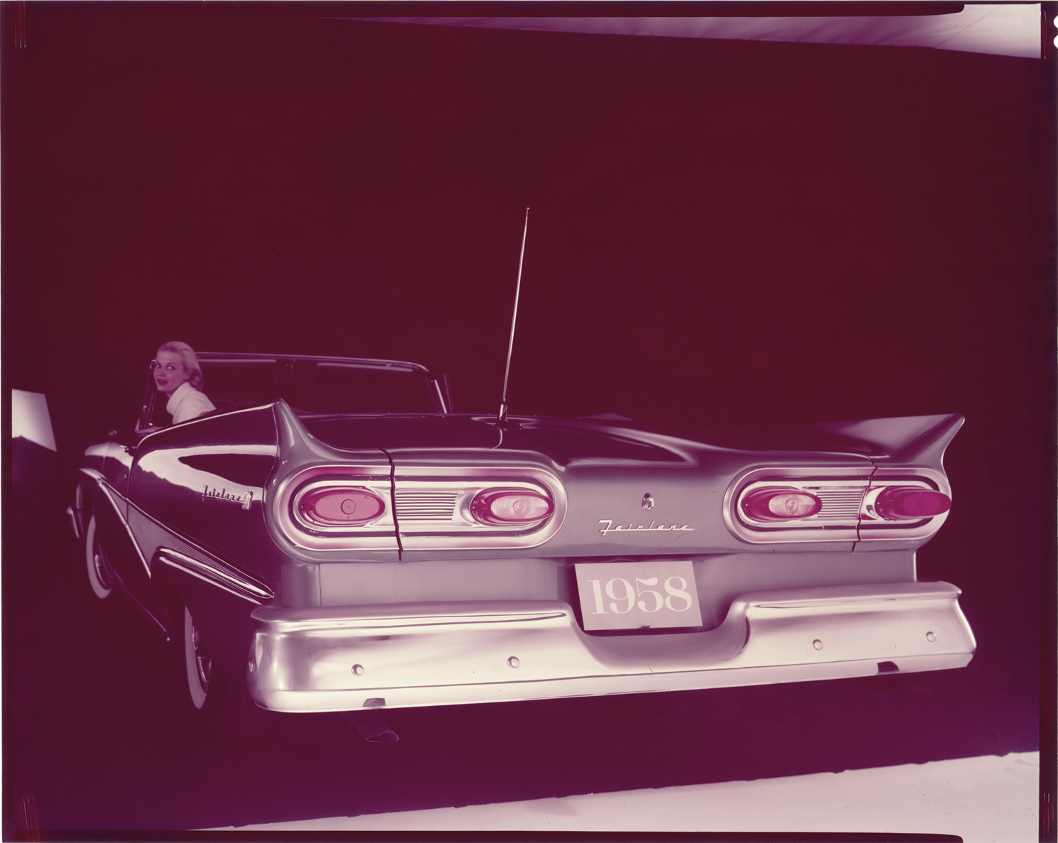 Favorite this☆ 1958 Ford Fairlane automobile Description: Rear view of a woman posing in a 1958 Ford Fairlane convertible. Label on sleeve: "Ford Motor Co., Ford convertible, 1958." Details Resource ID: na034752 Creator: Boulevard Photographic (Firm) Subject: Fairlane automobile Automobiles, Convertible Advertising--Automobiles Transparencies Date Issued: 1958 Format: 1 transparency : col. ; 8 x 10 in. Member of: National Automotive History Collection Mickey McGuire and Jim Northmore Boulevard Photographic Collection Filing Location: Ford, 5:3 Rights: Physical rights are retained by DPL. Copyright is retained in accordance with U.S. copyright laws.