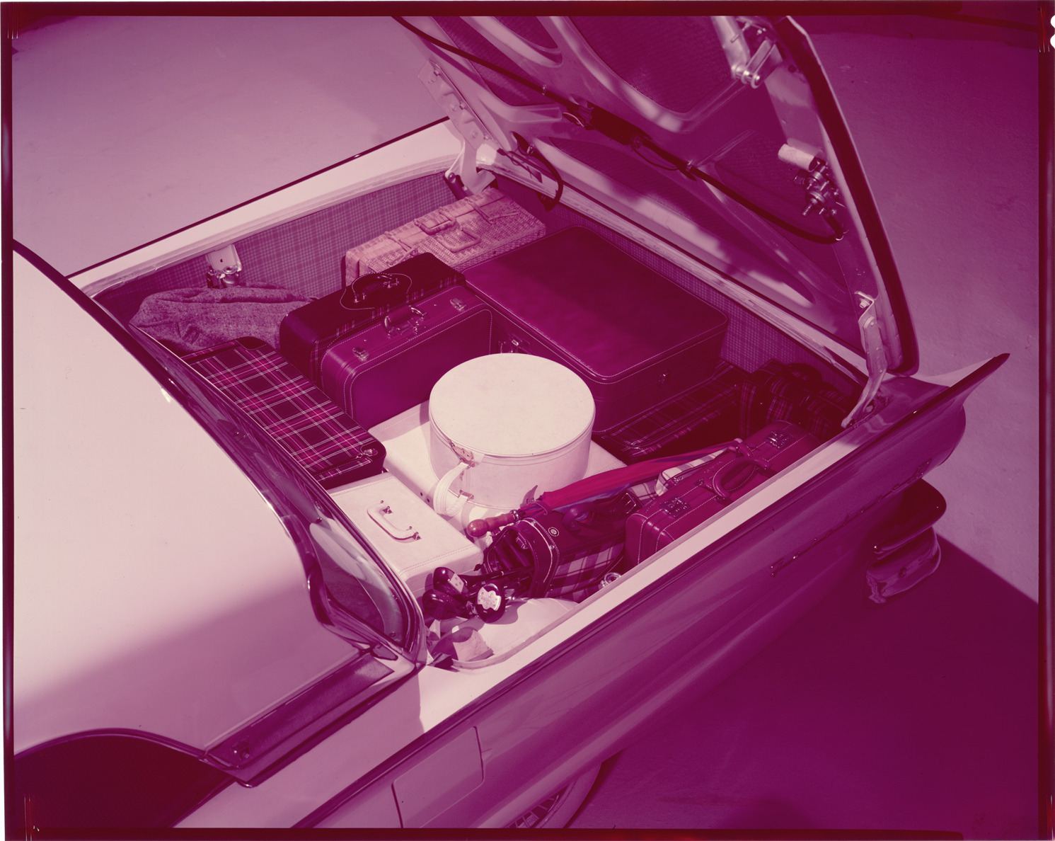 Favorite this☆ 1957 Ford Fairlane Skyliner automobile trunk Description: View of the open trunk of a 1957 Ford Fairlane Skyliner, showing suitcases and golf clubs. Label on sleeve: "Ford Motor Co., Ford Skyliner, 1957." Details Resource ID: na034772 Creator: Boulevard Photographic (Firm) Subject: Fairlane automobile Luggage Golf clubs (Sporting goods) Advertising--Automobiles Transparencies Date Issued: 1957 Format: 1 transparency : col. ; 8 x 10 in. Member of: National Automotive History Collection Mickey McGuire and Jim Northmore Boulevard Photographic Collection Filing Location: Ford, 5:4 Rights: Physical rights are retained by DPL. Copyright is retained in accordance with U.S. copyright laws.
