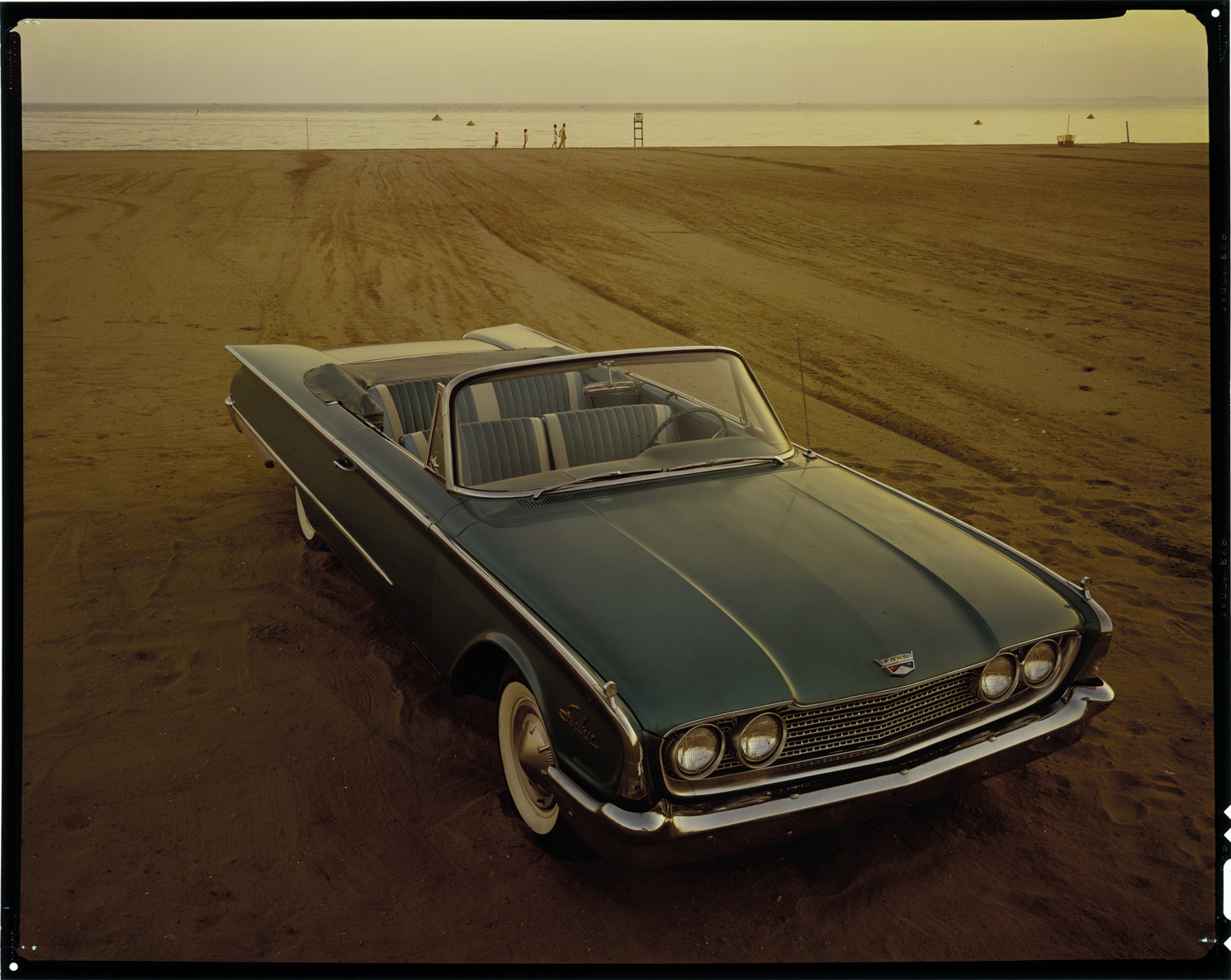 View of a 1960 Ford Sunliner convertible on the beach. Label on sleeve: "Ford Motor Co., Ford convertible, 1960."