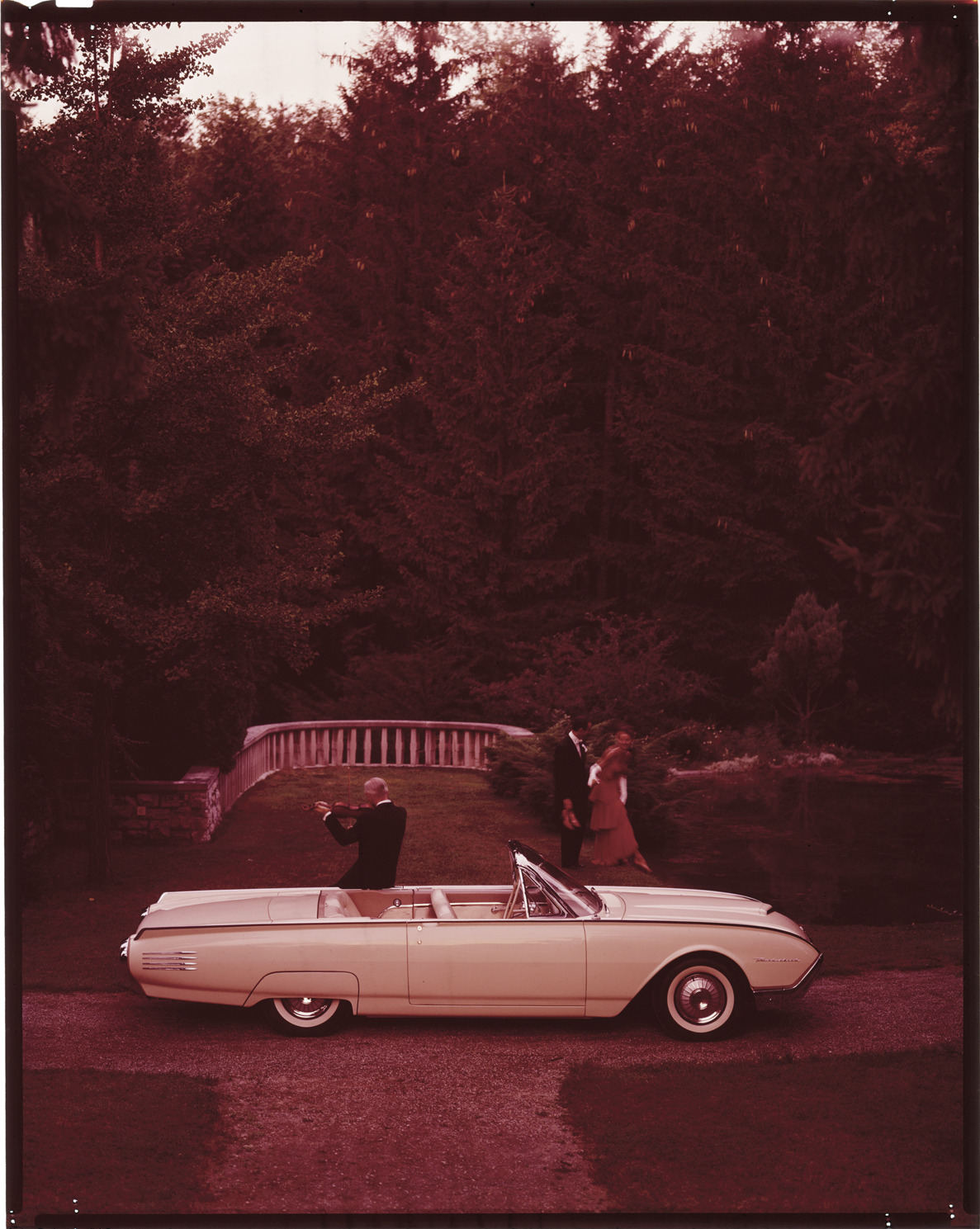 View of a man and woman, being serenaded by a violinist, with a 1961 Ford Thunderbird convertible. Label on sleeve: "Ford Motor Co., Ford Thunderbird, 1961."