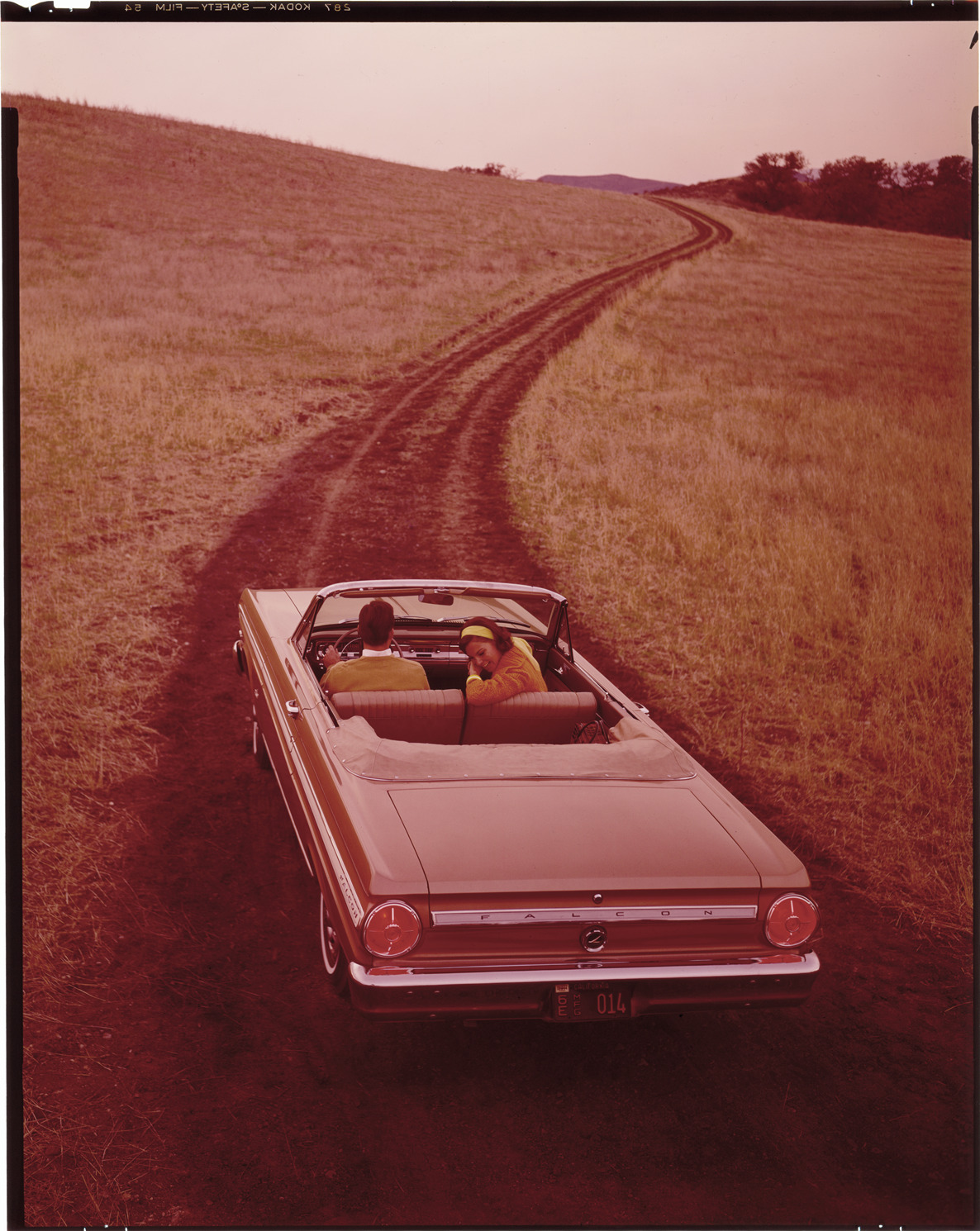 View of a man and woman posing in a 1965 Ford Falcon convertible. Label on sleeve: "Ford Motor Co., Ford Falcon convertible, 1965."