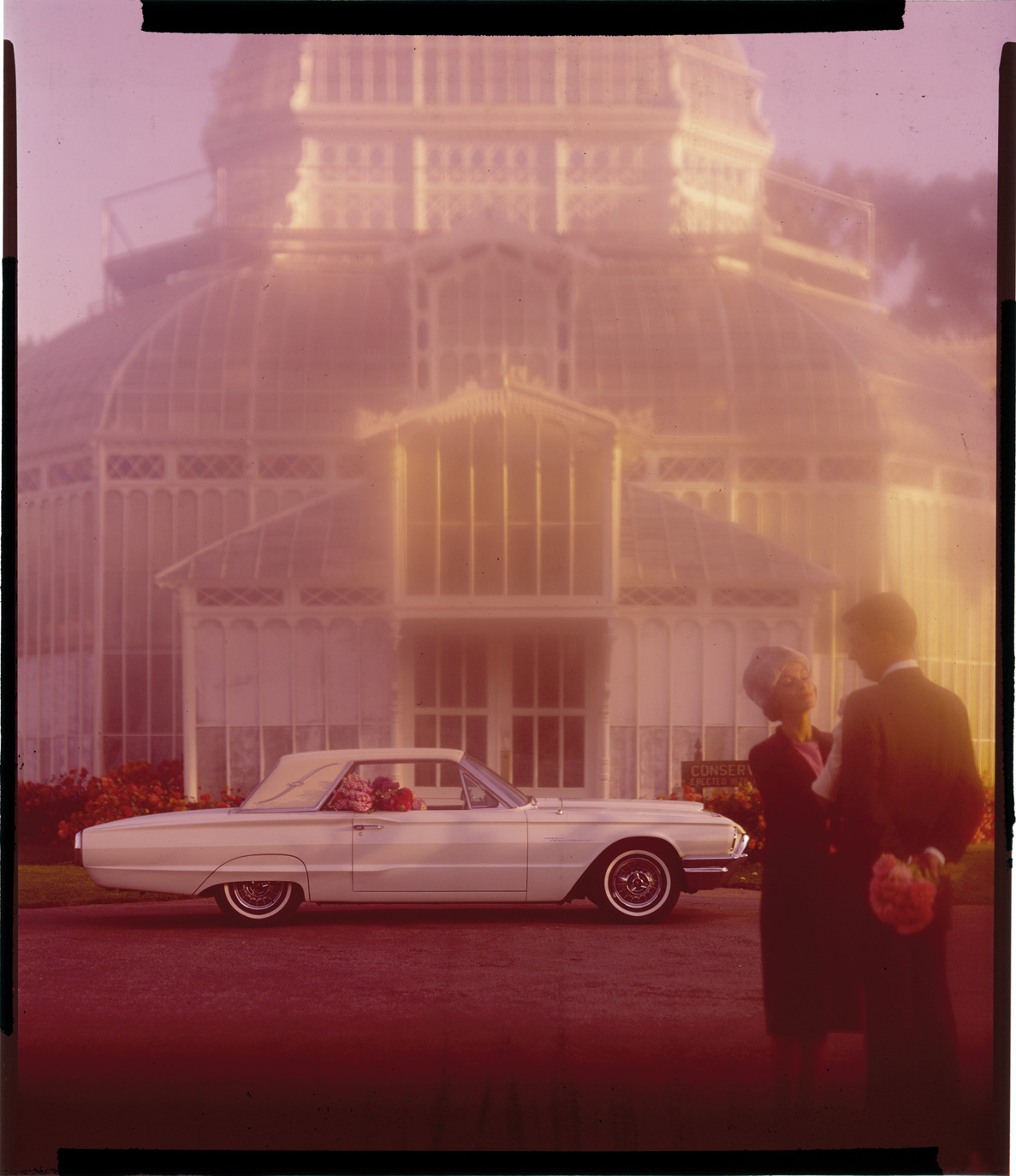 View of a Ford Thunderbird coupe. Man and woman in foreground; conservatory in background. Label on sleeve: "Ford Motor Co., Ford Thunderbird, 1964-65."
