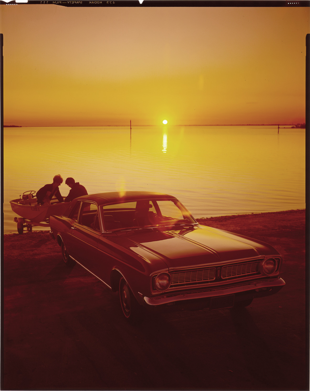 View of a 1969 Ford Falcon coupe. Man and woman fasten boat to trailer behind car. Label on sleeve: "Ford Motor Co., Ford Falcon, 1969."