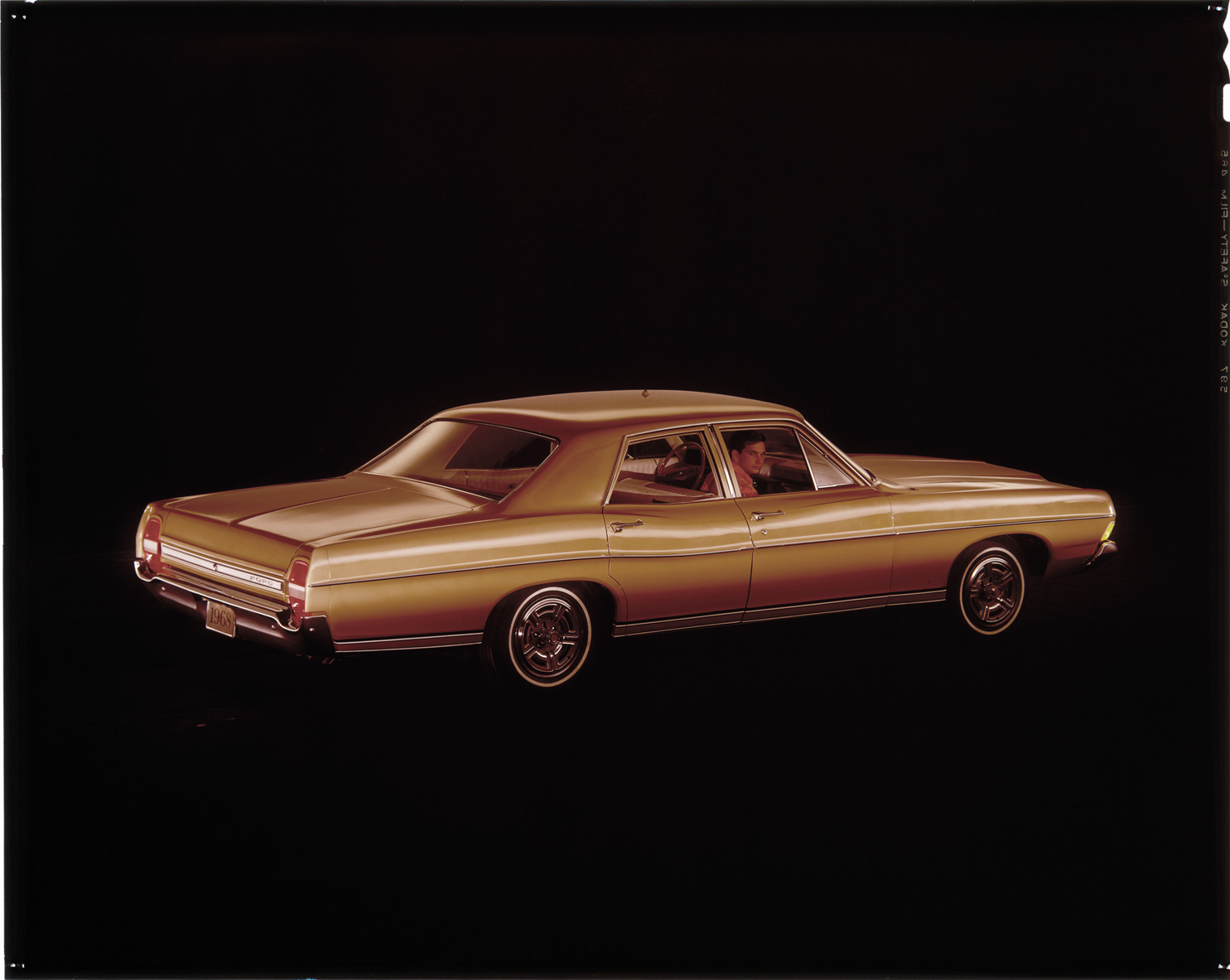 View of a man posing in a 1968 Ford sedan. Label on sleeve: "Ford Motor Co., Ford, 1968."