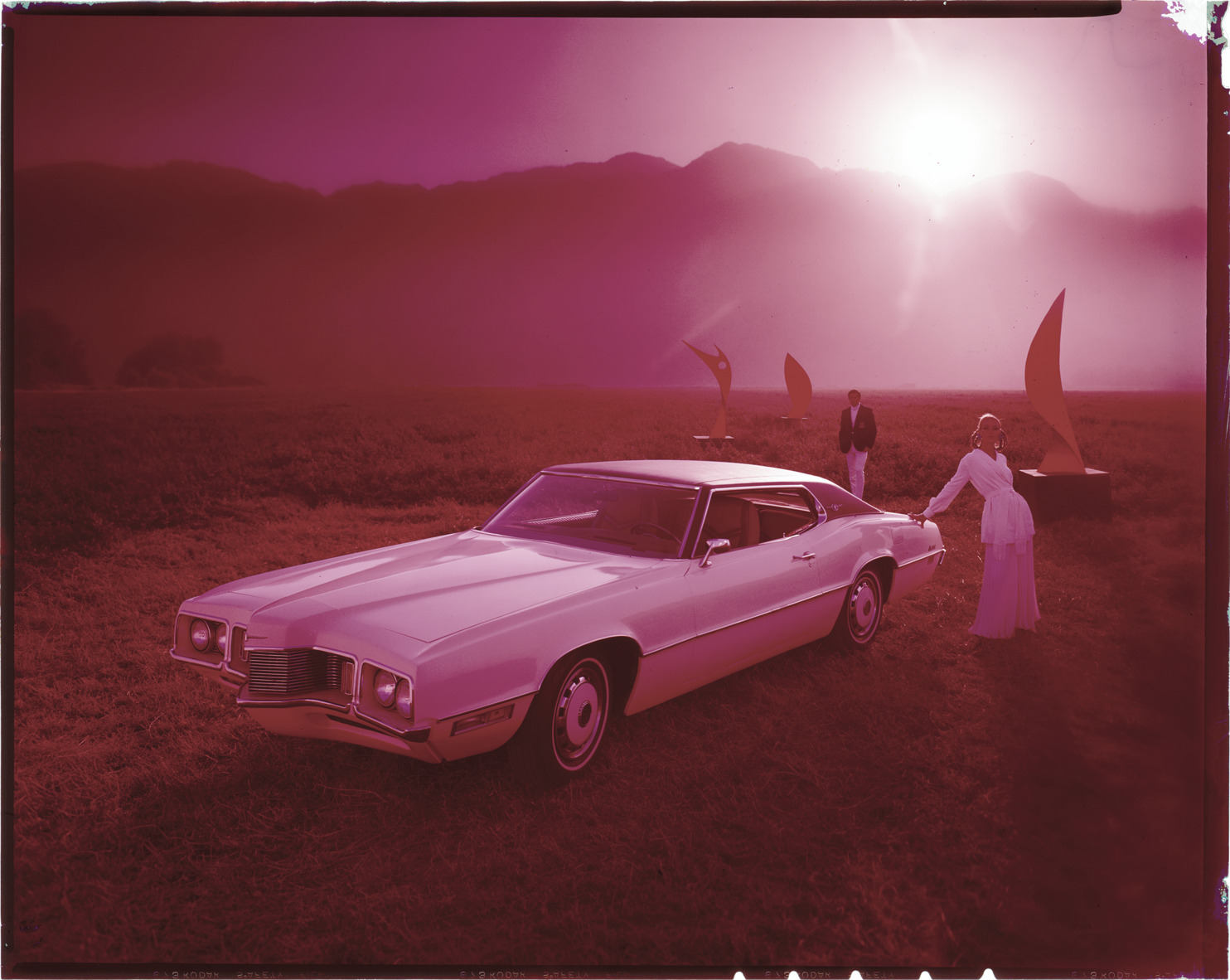 View of a man and woman posing with a 1970 Ford Thunderbird coupe. Sculptures are displayed in background. Label on sleeve: "Ford Motor Co., Ford Thunderbird, 1970."